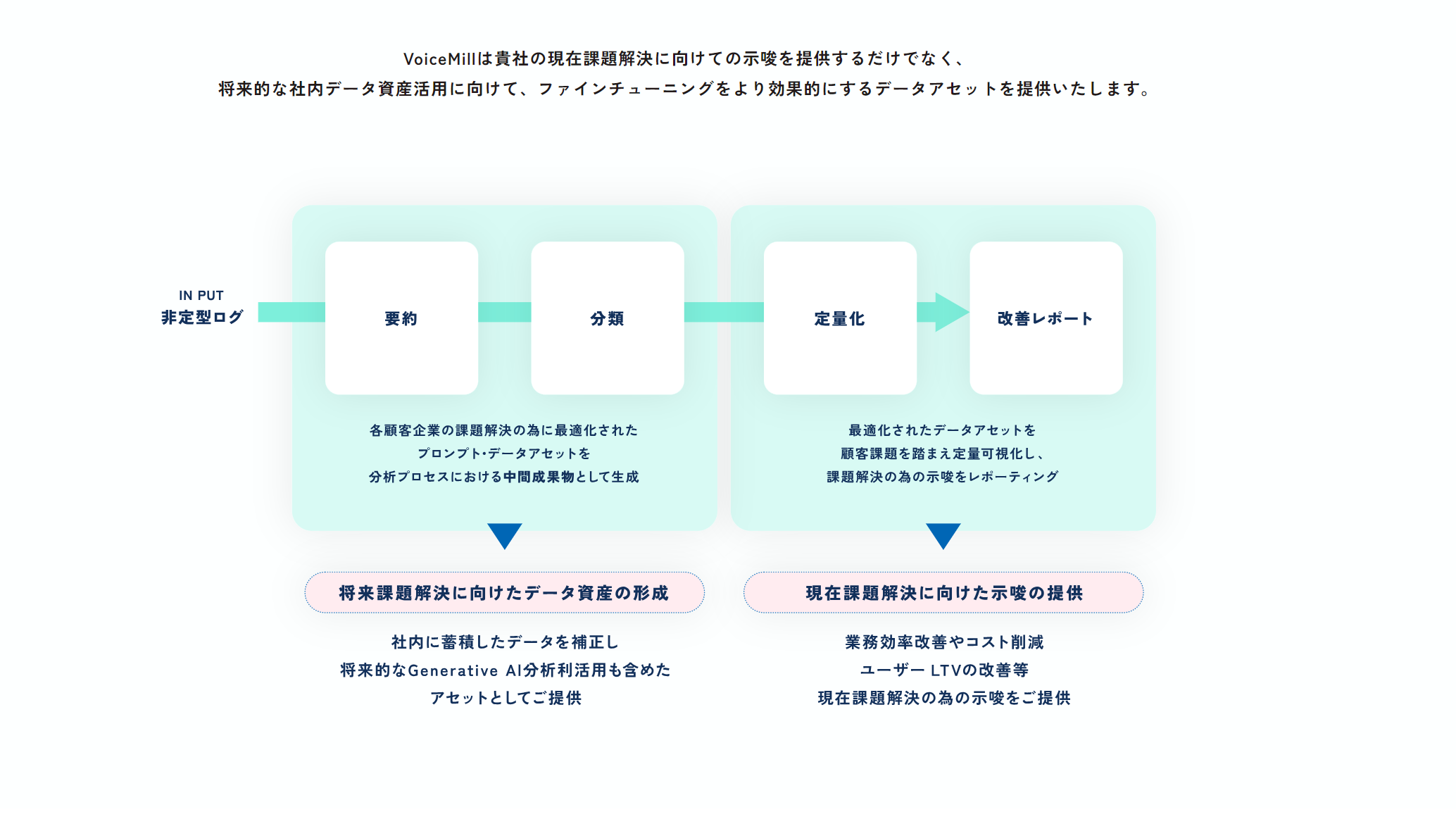 Voice Millは顧客が蓄積した非定型ログデータ(ユーザーボイス)を提供いただくだけでその要約から要素分類を行い、定量可視化、事業改善のレポートまでを一気通貫で行い、