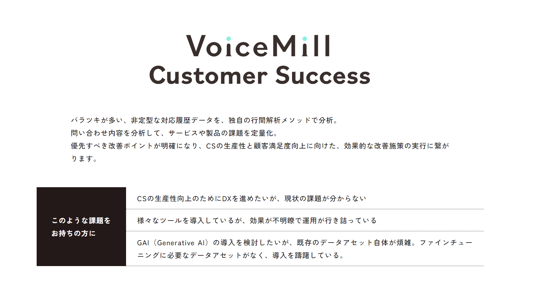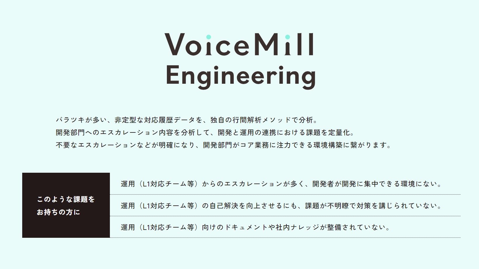 本サービス名称である「Voice Mill(ボイスミル)」にはユーザーの声を要素分解(Mill)し、その声の奥にある本質的な課題を可視化(ミル/見る)するという意味が込められています。