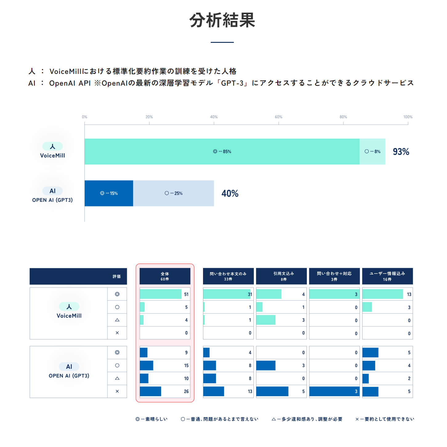 上図は、当社が60件の架空のメール問い合わせを、ヒトとAIで分析が可能となるよう要約をし、 要約内容を採点及び比較検証したものです。