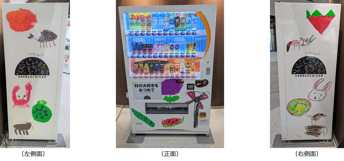 本自販機は、地域活性化策として企画されたもので、地元の小学1年生14名がいちごやキウイなど村の大好きなものを描いたイラストがラッピングされております。また、自販機側面には、新たな村づくりの旗印として制作された村の「シンボルマーク」がデザインされており、訪れる方々に佐那河内村に対する愛着を感じていただけるものと期待しております。