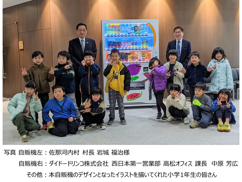 ダイドードリンコ株式会社(本社:大阪市北区、代表取締役社長 中島 孝徳)は、徳島県名東(みょうどう)郡佐那河内村と共同で、地元の小学1年生が描いた作品をラッピングしたオリジナル自動販売機(以下、本自販機)を 、12月22日(木)に佐那河内村役場に設置いたしました。