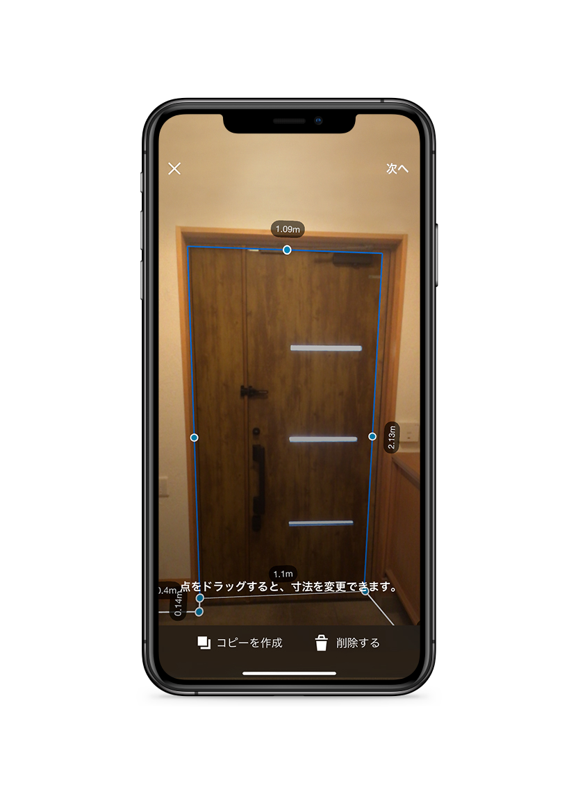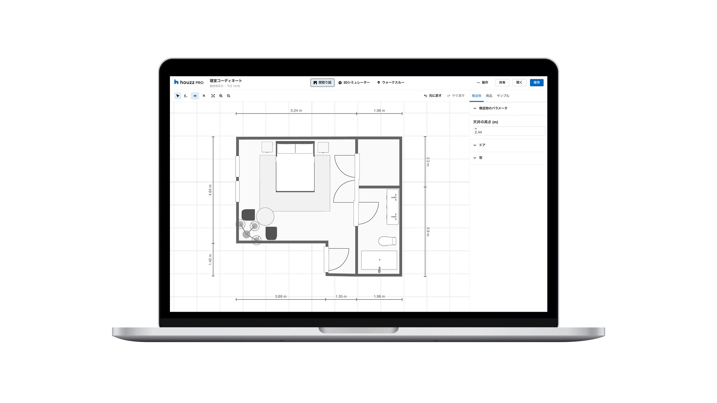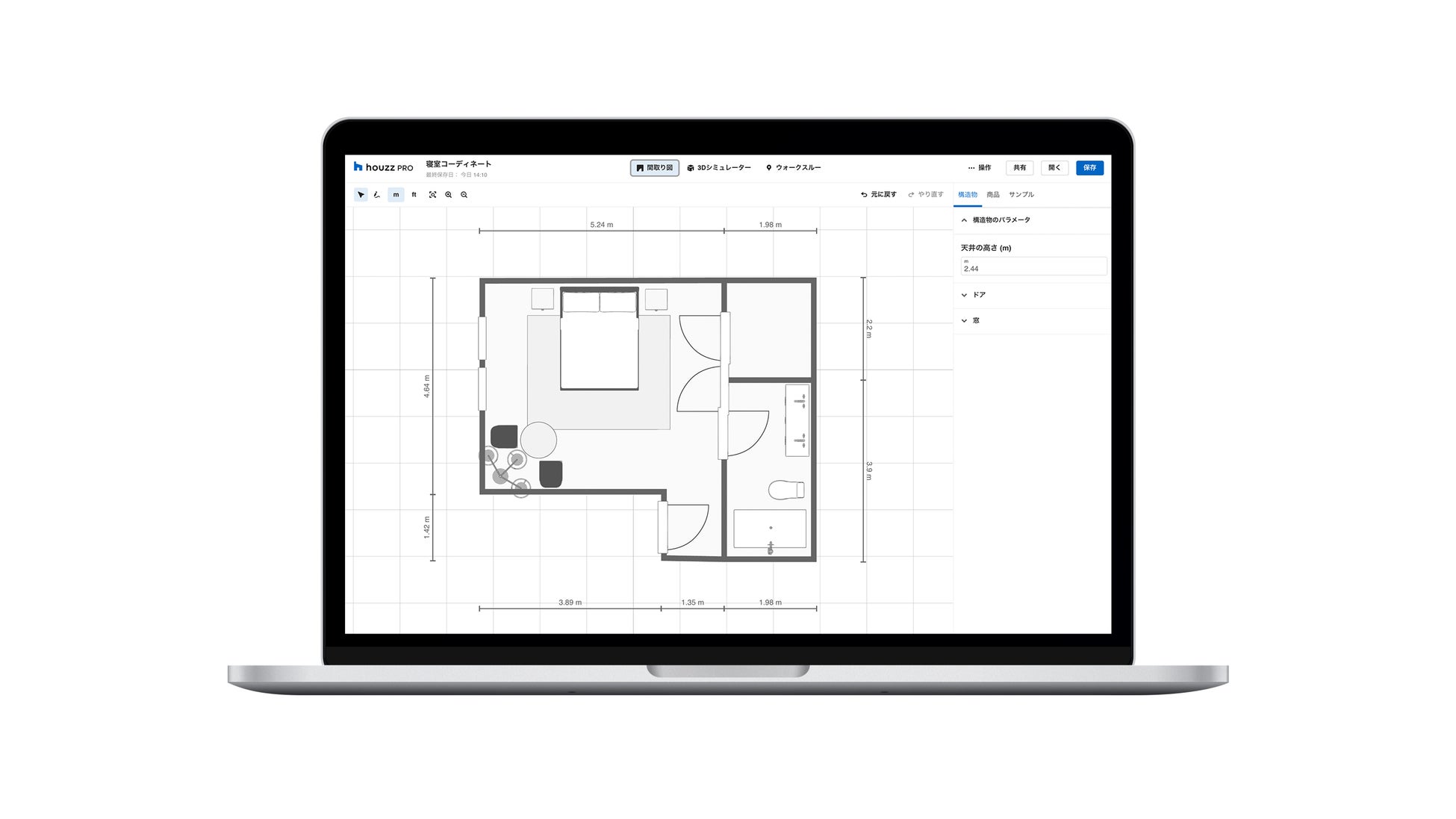 Houzz Pro モバイルアプリの AR 技術を使った寸法測定ツールは、スマートフォンで実際の床やドアの位置をスキャンするだけで部屋の寸法が測定され、自動的に 2D と 3D の間取り図に変換してくれます。作成された間取り図は、デスクトップの 3Dフロアプランナーで、家具や照明器具を追加したり、床材を指定したりと、様々な変更を加えることができます。