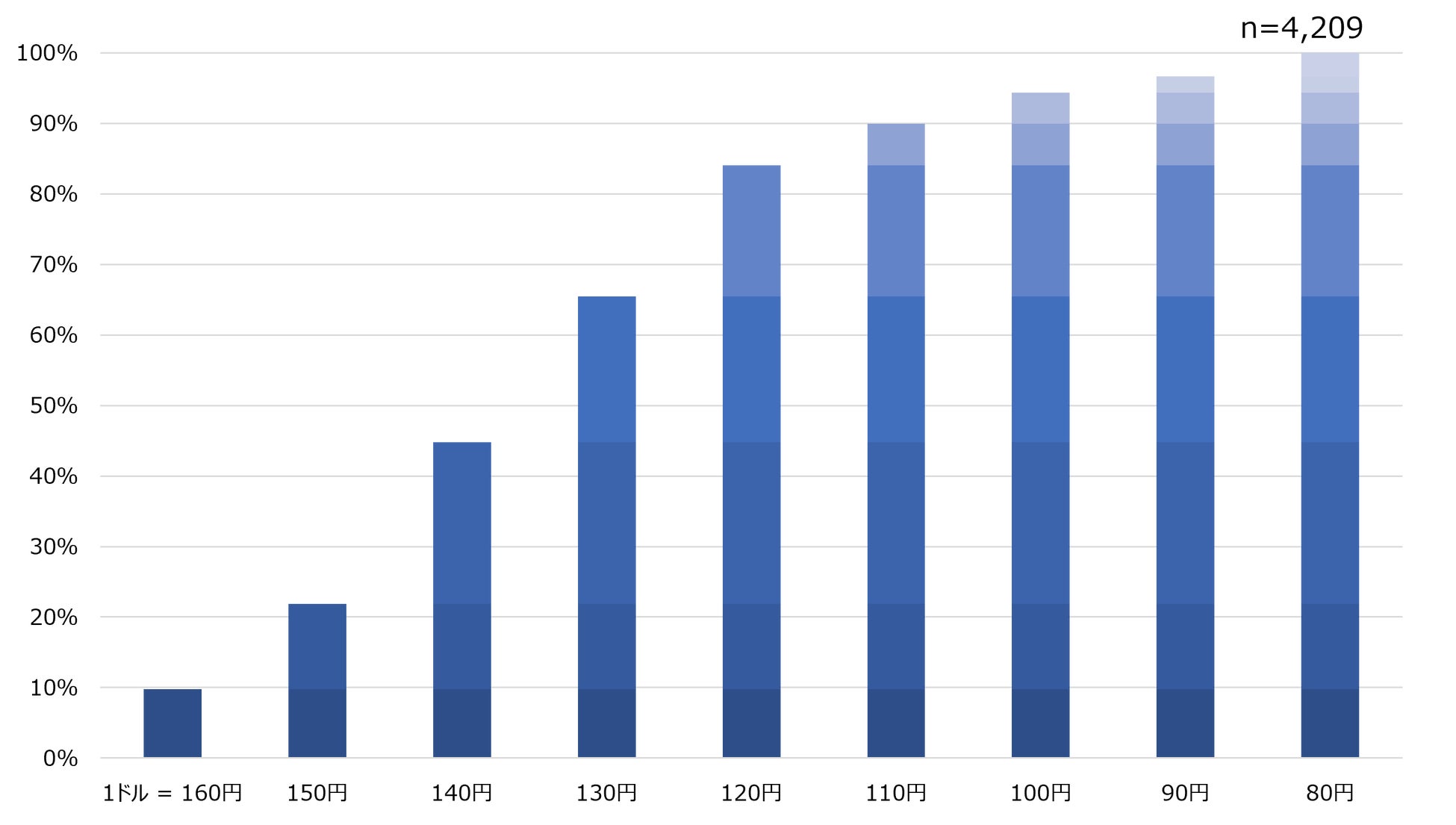 ※回答が円高レートに進むにつれて回答割合を積み上げています。