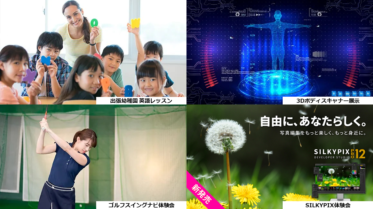 メインステージでは、横浜市にある幼稚園の園児たちと一緒に英語教材「サイバードリーム」を使った楽しい「出張幼稚園 英会話レッスン」を開催。常設エリアでは、自身のゴルフスイングを確認できる「ゴルフスイングナビ体験会」、人体の全身を3D撮影する「3Dボディスキャナー展示」、カメラ画像処理ソフトウェア「SILKYPIX体験会」などを行ないます。