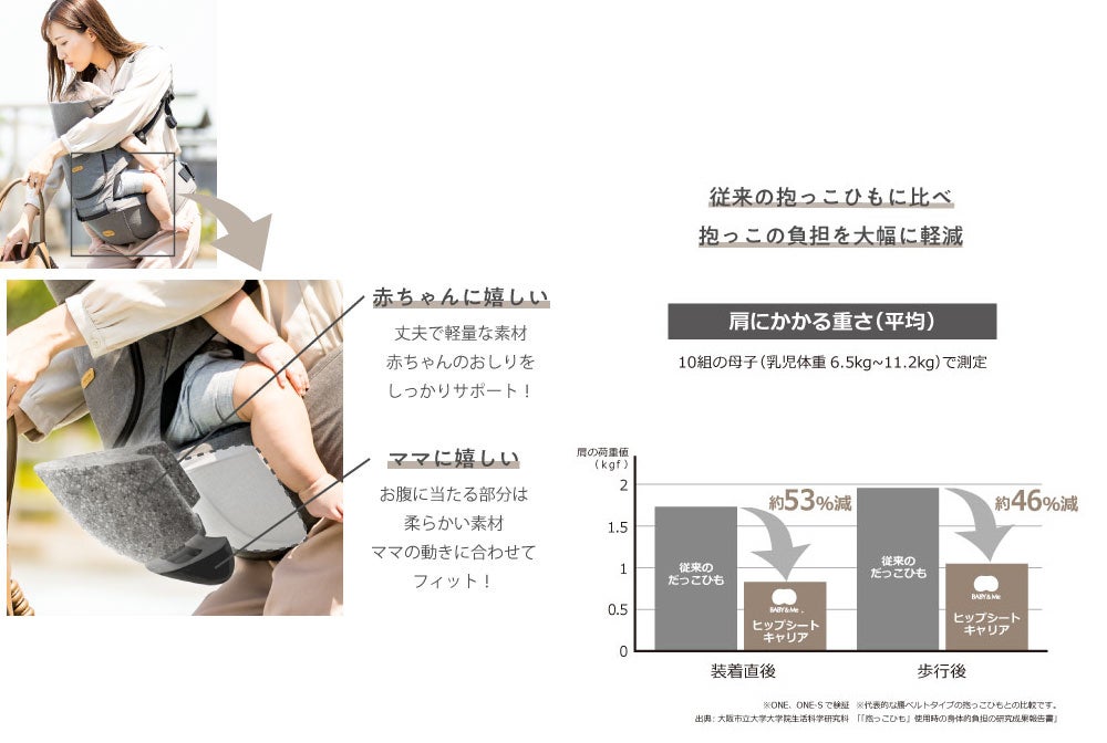 また、人間工学に基づいた設計は肩や腰への負担を大幅に軽減しており、大阪市立大学との共同研究では、従来の抱っこひもに比べてママやパパへの負担が約半分まで減少されることが立証されています。