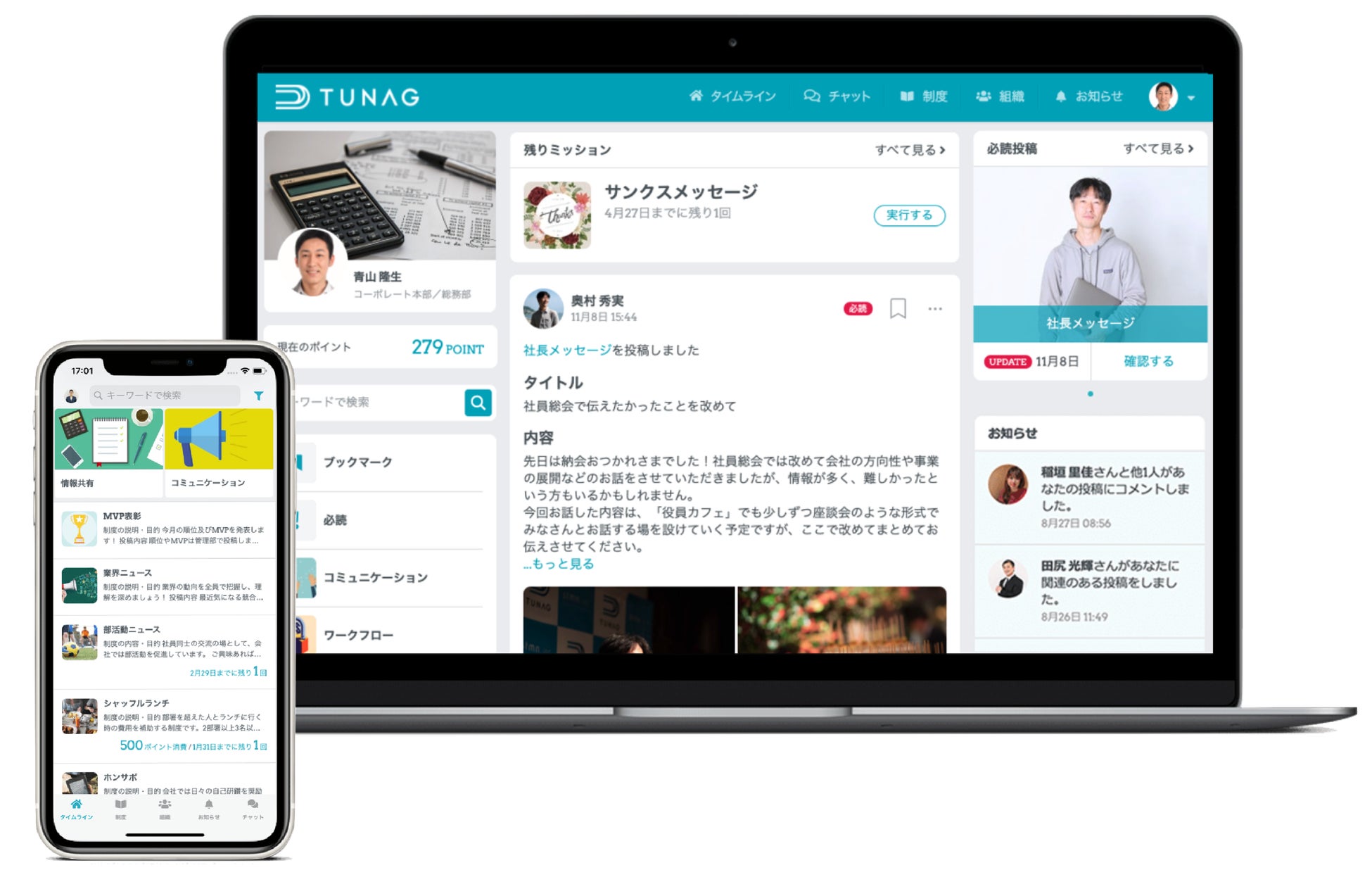 「社内制度」を軸としたコミュニケーションを行うことでエンゲージメントを高め、強い組織づくりを支援します。従業員数一万名超のグローバル企業から、十数人の企業や団体まで、規模や業種、業態を問わず様々な企業でご導入いただいております。『TUNAG』サービスサイト:https://tunag.jp/ja/