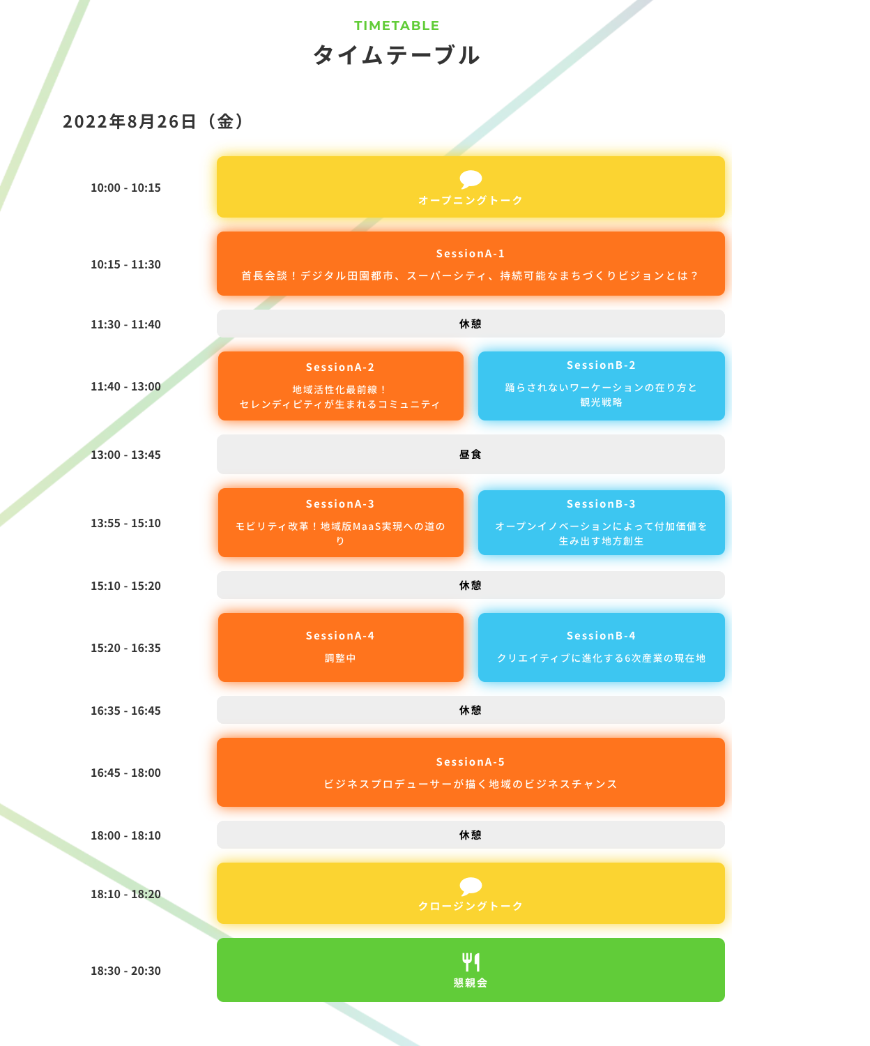 あらゆる分野から地域経済に携わる専門家、業界の最前線で活躍するプレイヤーがこの日のために各地から上士幌町に集結。50名のスピーカーによるトークセッションをお楽しみください。