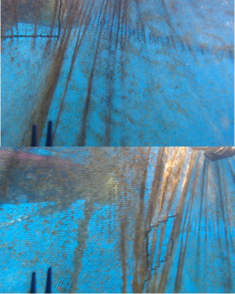 水中ドローン「DiveUnit300」に搭載した高圧洗浄機による網の清掃前と後