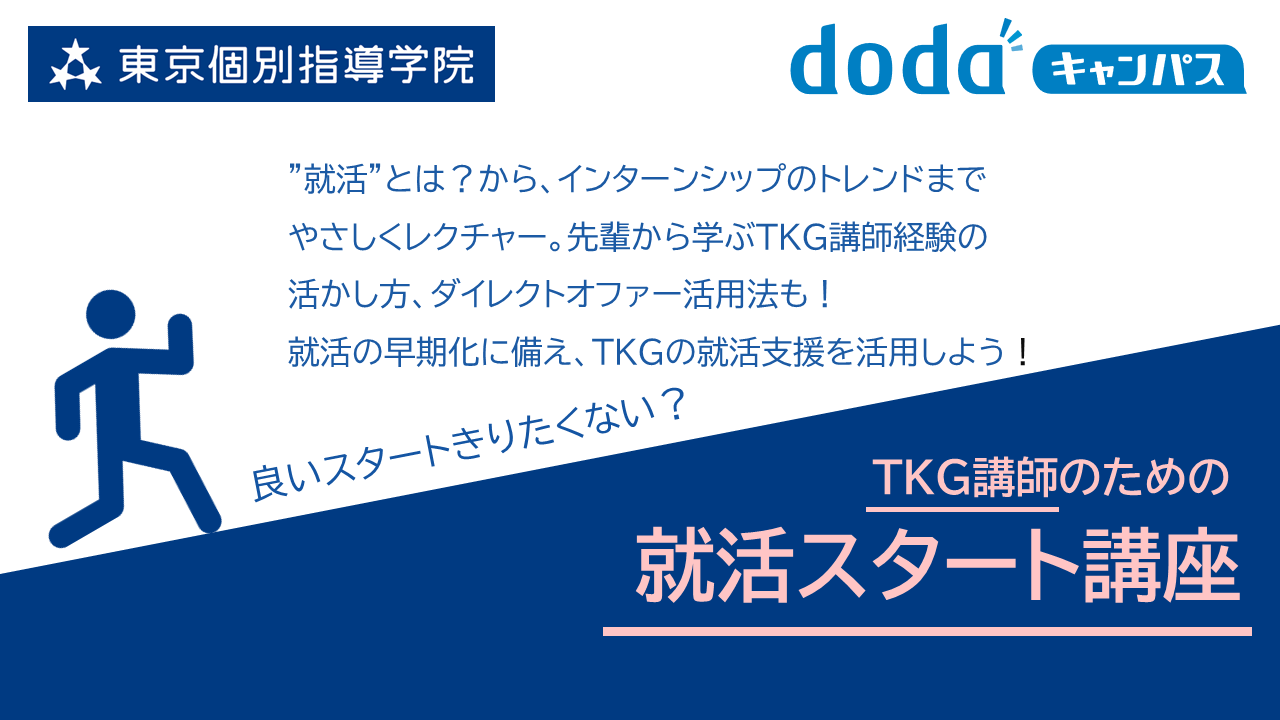 - TKG×dodaキャンパス就活スタート講座……就活の早期化に備えた初期講座。最新の就活トレンドから、実際の就活生のスケジュールまで解説。TKG講師経験が就活のどんな場面で活かされるか、具体的な事例をもとにレクチャー。