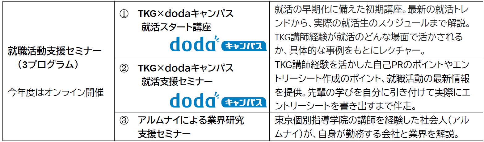 - TKG×dodaキャンパス就活支援セミナー……TKG講師経験を活かした自己PRのポイントやエントリーシート作成のポイント、就職活動の最新情報を提供。先輩の学びを自分に引き付けて実際にエントリーシートを書き出すまで伴走。