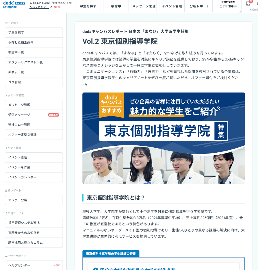 成長支援型就活サービスである「dodaキャンパス」の特性を活かして、企業からのオファー(選考の案内)を促進するため、企業向けに特集記事(画像参照)や、営業およびバナー広告等で、東京個別指導学院の学生講師人材の強みを企業に対してアピールしていきます。