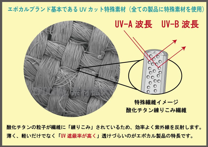 エポカル(EPOCHAL)は、英語で画期的な、という意味。名前通り「画期的な」UVカットウエアを作っています。洗濯を何度繰り返しても落ちない特殊繊維で作ったUVカットウエアだけを制作しています。