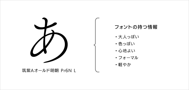フォント選定の時間短縮や、表現したいデザインの「イメージ」「印象」に合わせたフォント選びにご活用いただけます。