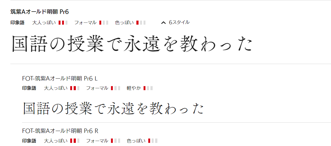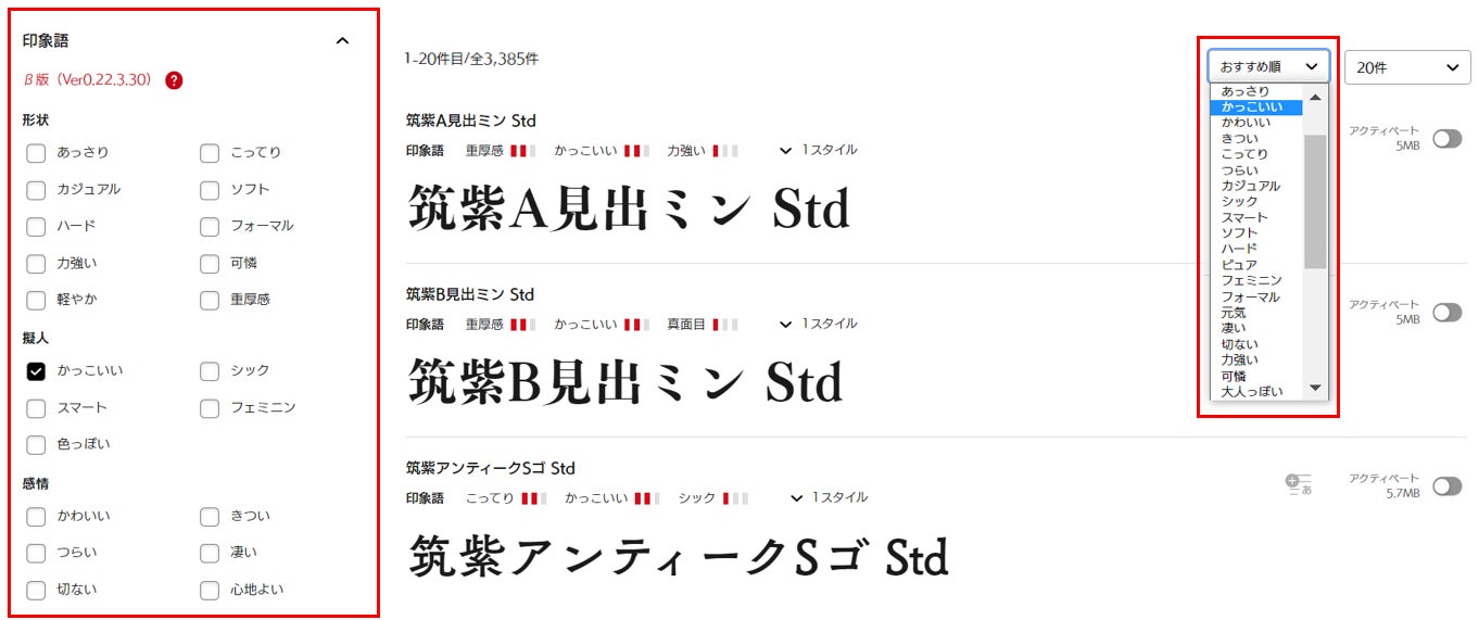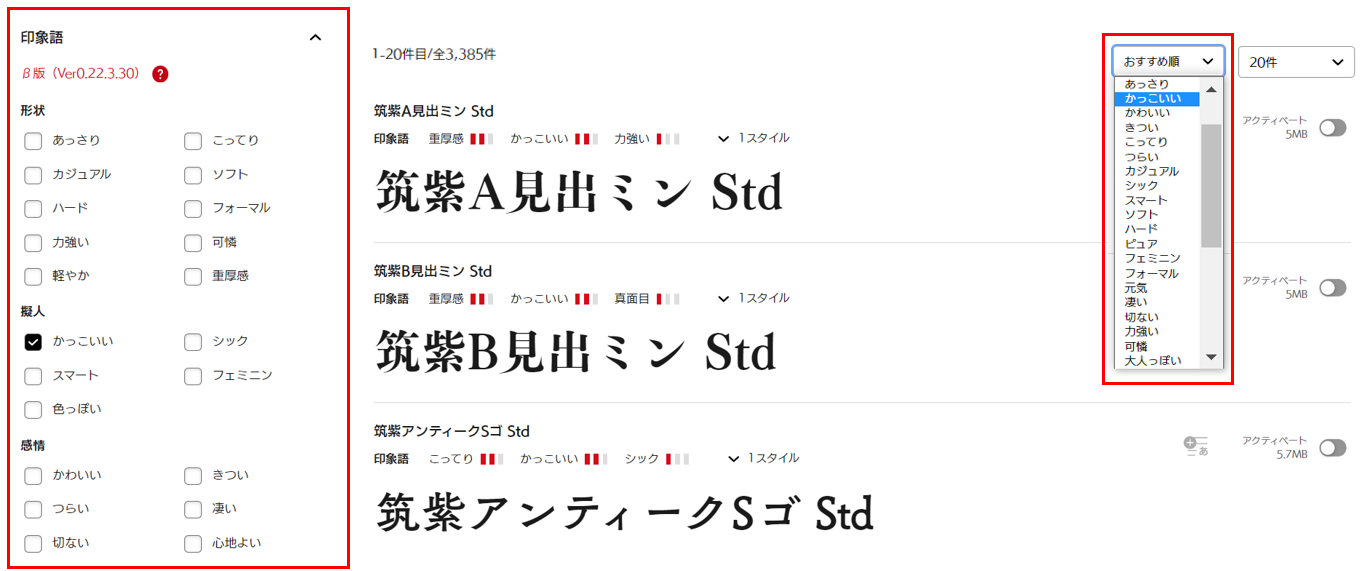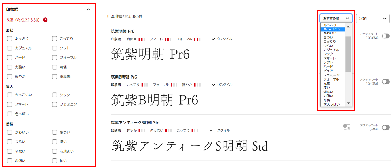 3.一覧画面では、各フォントに登録されている印象語のうち、数値の高い上位3語が表示されます。