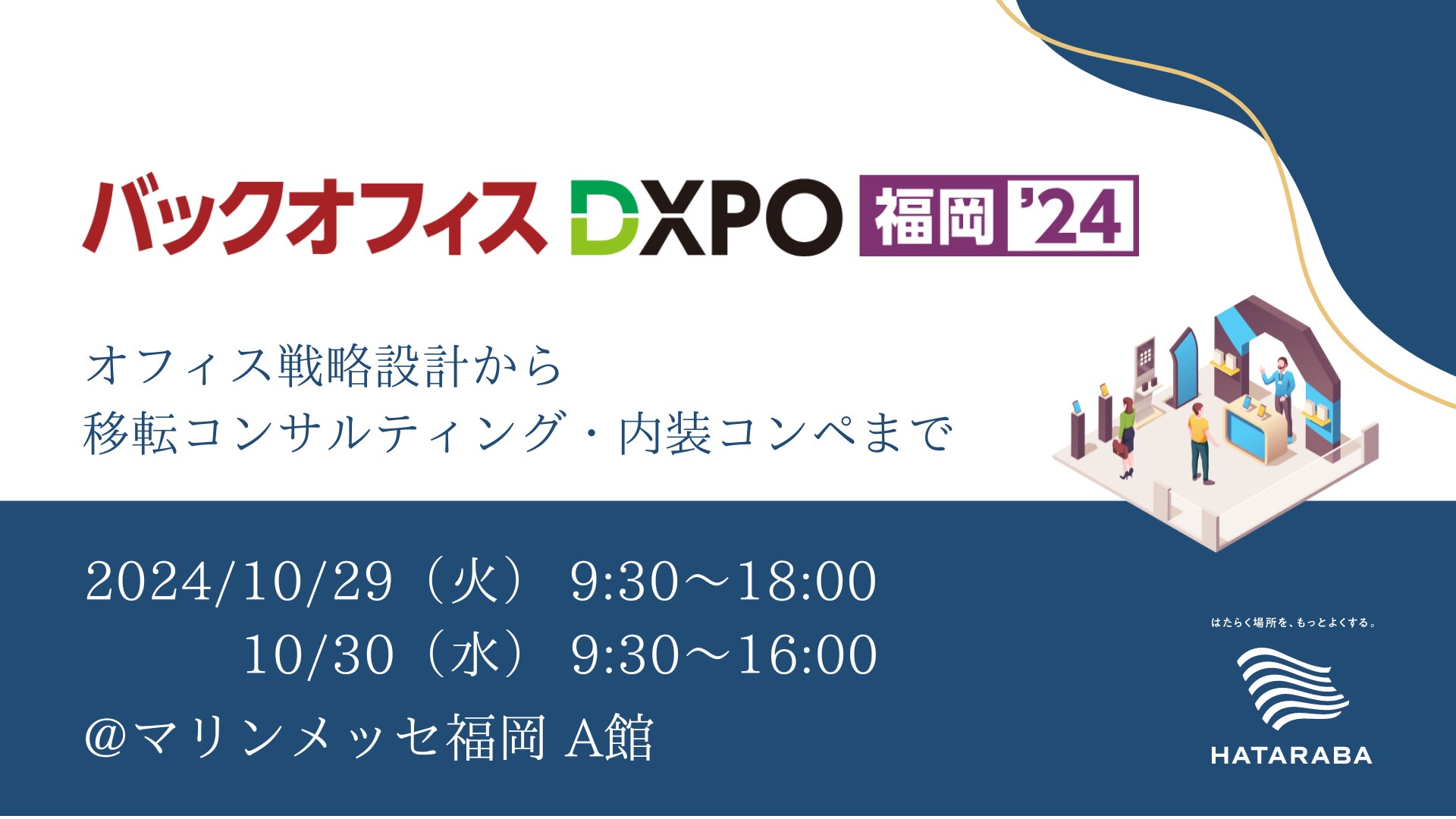 オフィス移転コンサルティング、オフィス仲介サービスや物件検索サイト【HATARABAオフィス】など、はたらく場所の最適化=HATARABA(ハタラバ)を展開する株式会社HATARABA(本社:東京都渋谷区、代表取締役:森村泰明)は、2024年10月29日~30日の2日間マリンメッセ福岡 A館で開催される「バックオフィスDXPO 福岡」に出展し「はたらく場所の最適化サービス」をご紹介します。