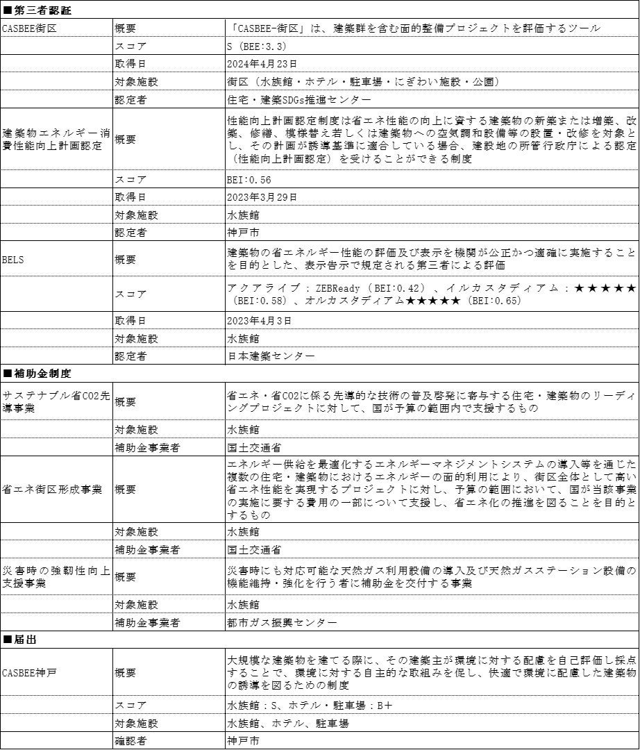 その他にも、建築物の省エネ性能を表示する第三者認証制度の1つである「BELS」では、水族館におけるZEBReadyの取得や、サステナブル省CO2先導事業、省エネ街区形成事業、災害時の強靭性向上支援事業にリーディングプロジェクトとして採択されるなど、様々な環境認証の取得や、補助事業への取組みなどにより、環境に配慮しております。(取得認証等の概要については末尾の表1をご参照ください。)