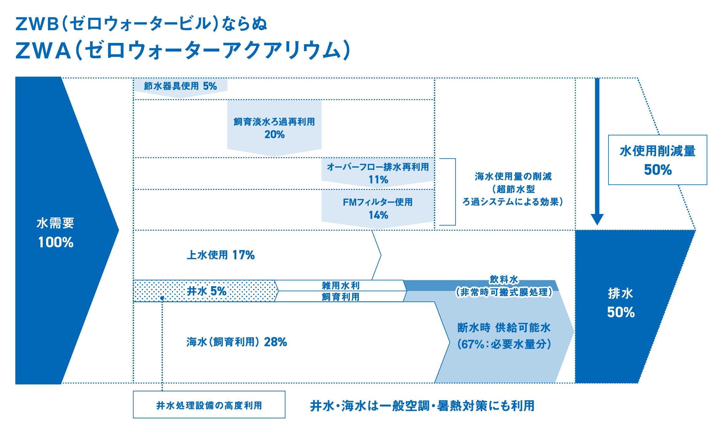 超節水型ろ過システムでの海水使用量の削減、井水処理設備の高度利用による一般空調・暑熱対策などを行うことで、全体の水使用の削減をいたします。