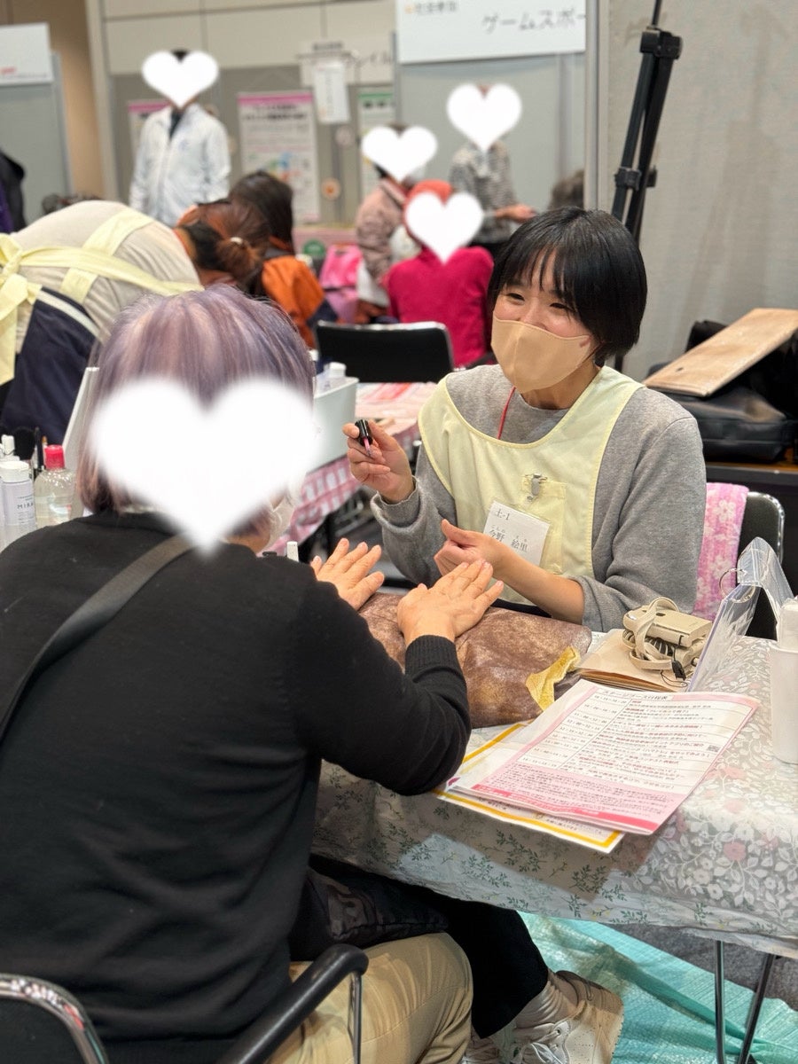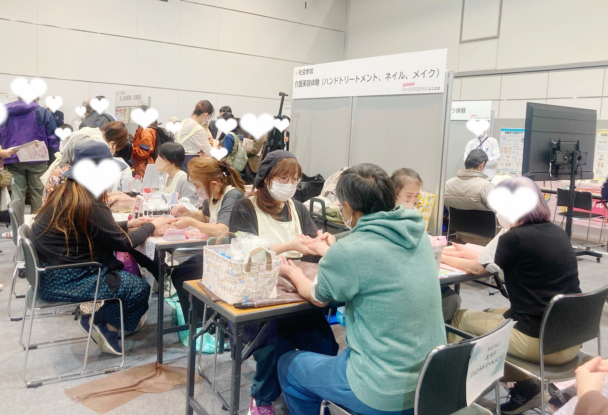 当日は横浜校の受講生と卒業生が中心となり、来場者にネイルケアやハンドトリートメント、ポイントメイクなどの美容体験を提供。ブース前には順番を待つ列ができるほどの盛況となり、美容を通じて高齢者の笑顔と交流が広がる一日となりました。