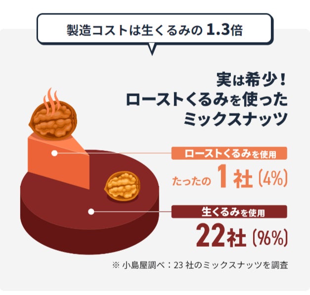 そんな話をすると、「じゃあミックスナッツのくるみはローストした方がいいに決まってるじゃないか?」という声が出ると思いますが、ローストくるみを使ったミックスナッツが少ない理由があるんです。