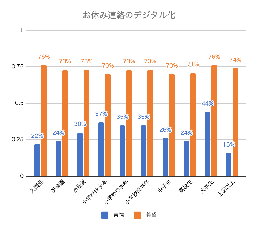 お休み連絡のデジタル化を希望している保護者の方が70%以上であるのに対し、実際にデジタル化を導入している施設は30%前後にとどまることが分かりました。その中でも保育園や幼稚園といった「未就学児施設」では、実情と希望の差が大きくなる傾向にあるようです。預かる人数が少なくデジタル化による効率化が期待しにくいことや、導入に向けた担当者の配置が難しいことも考えられます。
