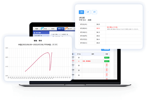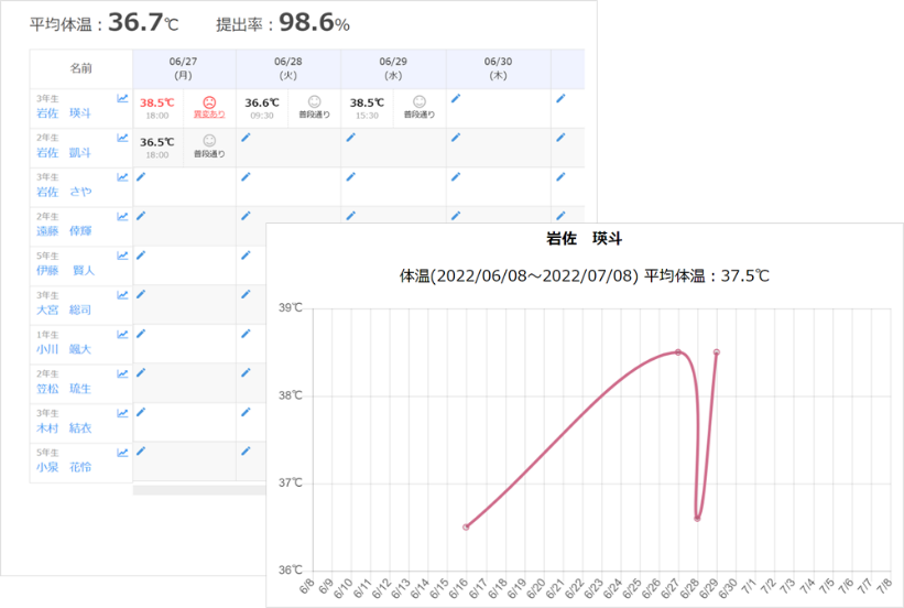 児童の平均体温や・体調管理の提出状況が管理画面から一目で確認できるようになり、日々の体調の変化を自動集計しPDFファイルとして出力することが可能です。