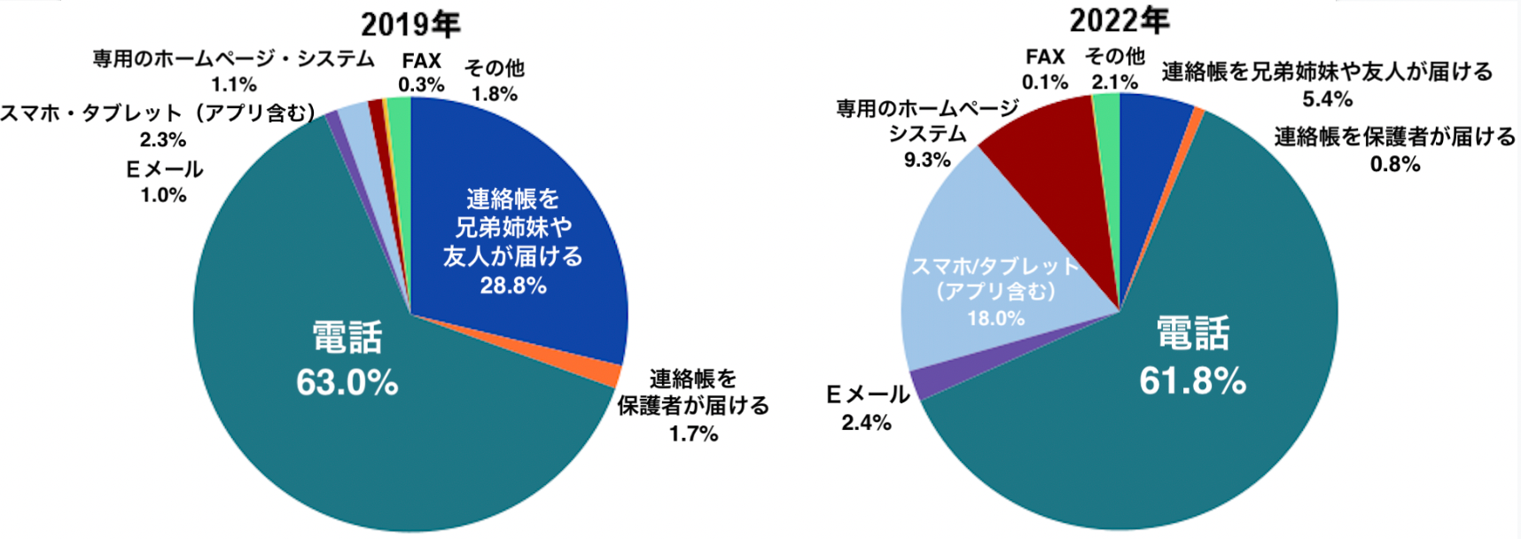 園・学校を休む時の連絡方法は「電話連絡」が最も多く約62%という結果になりました。電話連絡が占める割合についてはコロナ下前の2019年と比較して大きな変化はありませんが、「スマホ/タブレット(アプリを含む)」を連絡方法として利用している方がコロナ前よりも16%増加し、一方で日本の教育現場の主流であった「連絡帳を兄弟姉妹や友達が届ける」方法が、2019年が29%だったのに対し今回の調査では5.4%まで下がるなど、教育現場においても少しずつデジタル化の導入が進んできていることがうかがえます。