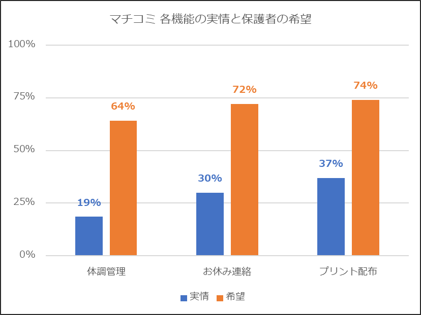 「体調管理のデジタル化」では、保護者の希望が64.2%であることに対し、実情は18.5%となっています。体調管理は多くの学校や施設で「紙に記入して提出する」という文化が根強く、体調の確認や管理方法がルーティンとして確立されているため、デジタル化への移行ハードルが高いことがうかがえます。