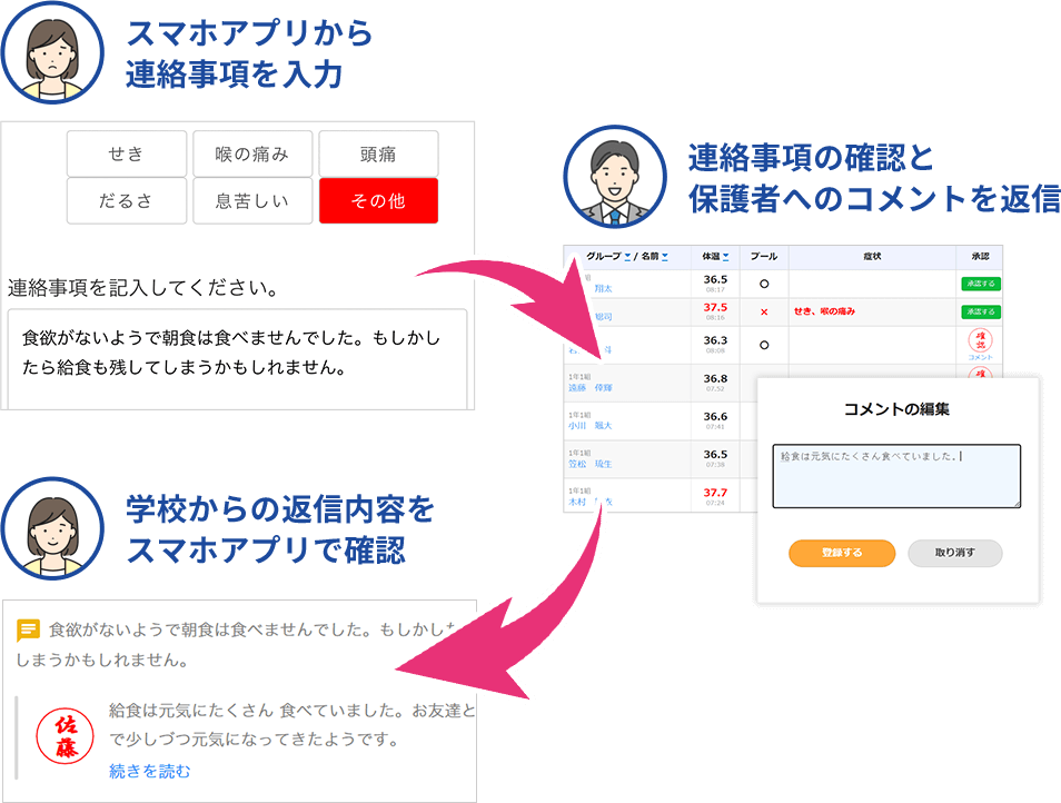 今までの保護者から管理者に送る一方通行の連絡だけではなく、管理者による承認(電子印捺印)やコメントの返信が可能になりました。これにより体調の連絡だけではなく”連絡ノート”としても活用できるようになりました。