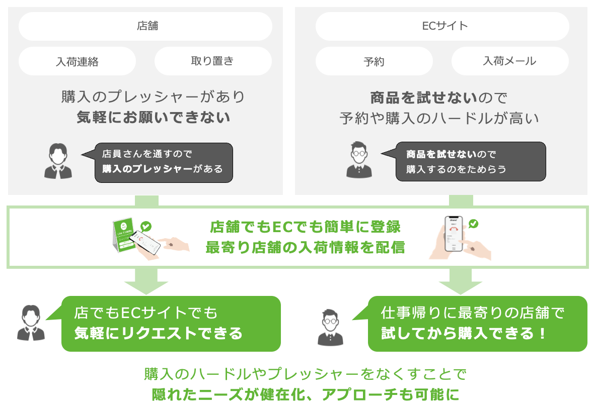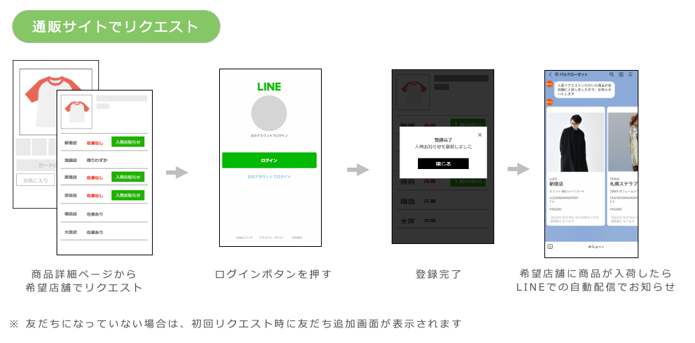 お客さまが商品の入荷通知をECサイトまたは実店舗でリクエストすれば、ECサイトでの入荷だけでなく、最寄りの実店舗での入荷まで自動で通知されるようになります。通知は再入荷商品だけでなく予約商品の初回入荷についても可能です。また、お客さまは会員登録やID連携なしに、LINEの友だち追加のみで通知をリクエストすることができるので、購入までのハードルを下げることができます。