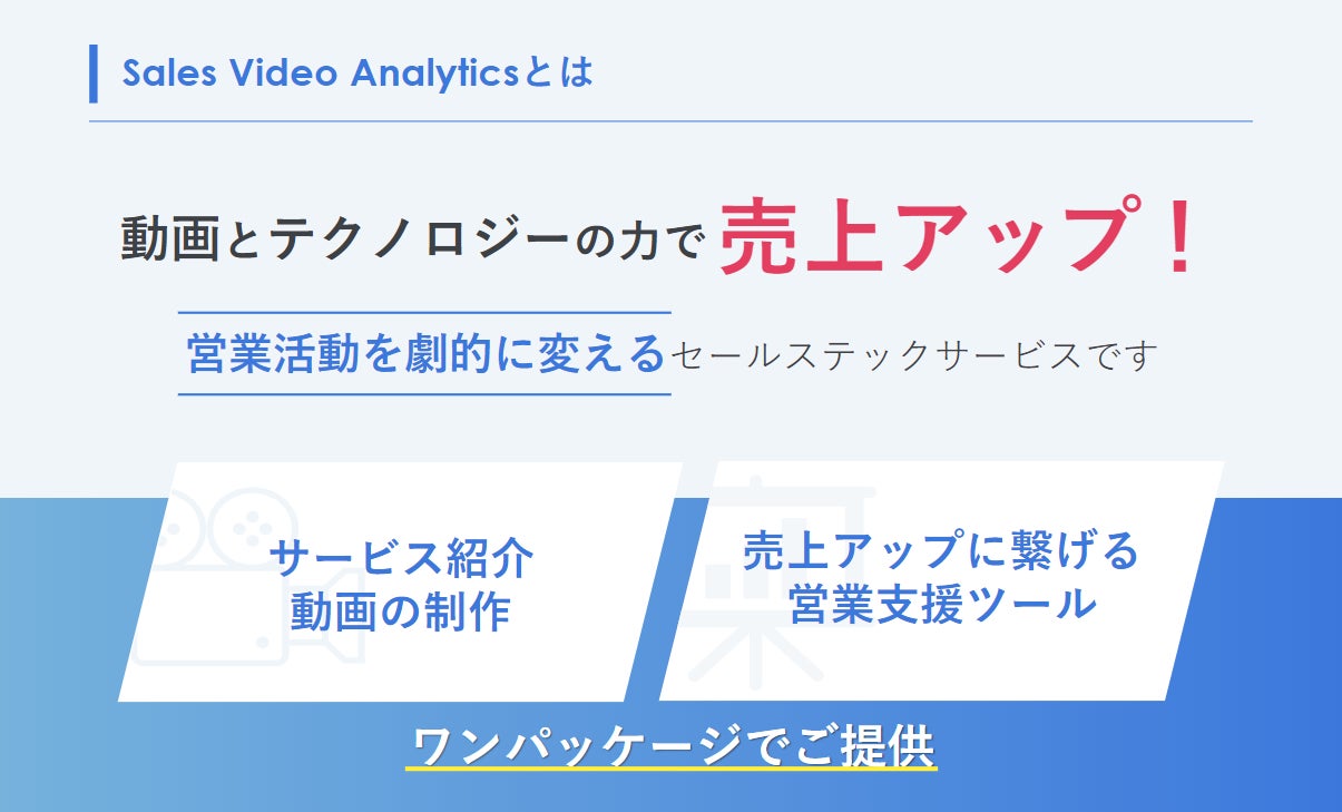 SalesVideo Analytics は営業活動のためのサービス紹介動画の制作と、売上アップに繋げる営業支援ツールをワンパッケージでご提供する、企業の営業活動を劇的に変えるセールステックサービスです。