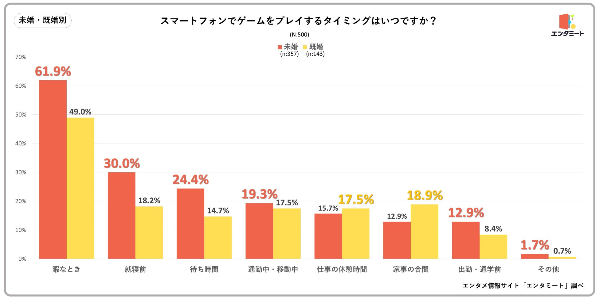 未婚・既婚別で見ると、「暇なとき」や「就寝前」、「待ち時間」と回答した人は未婚者が10%ほど多くなっています。既婚者の場合は、必然的に子どもがいる家庭も多くなると考えられ、育児などで忙しくなりスマートフォンゲームをプレイできるような時間が未婚者に比べて少ないと推察されます。その一方で「家事の合間」と回答した人は既婚者が6%多く、これは家事を専業主婦・主夫が担当している家庭が一定数あることが理由だと考えられます。