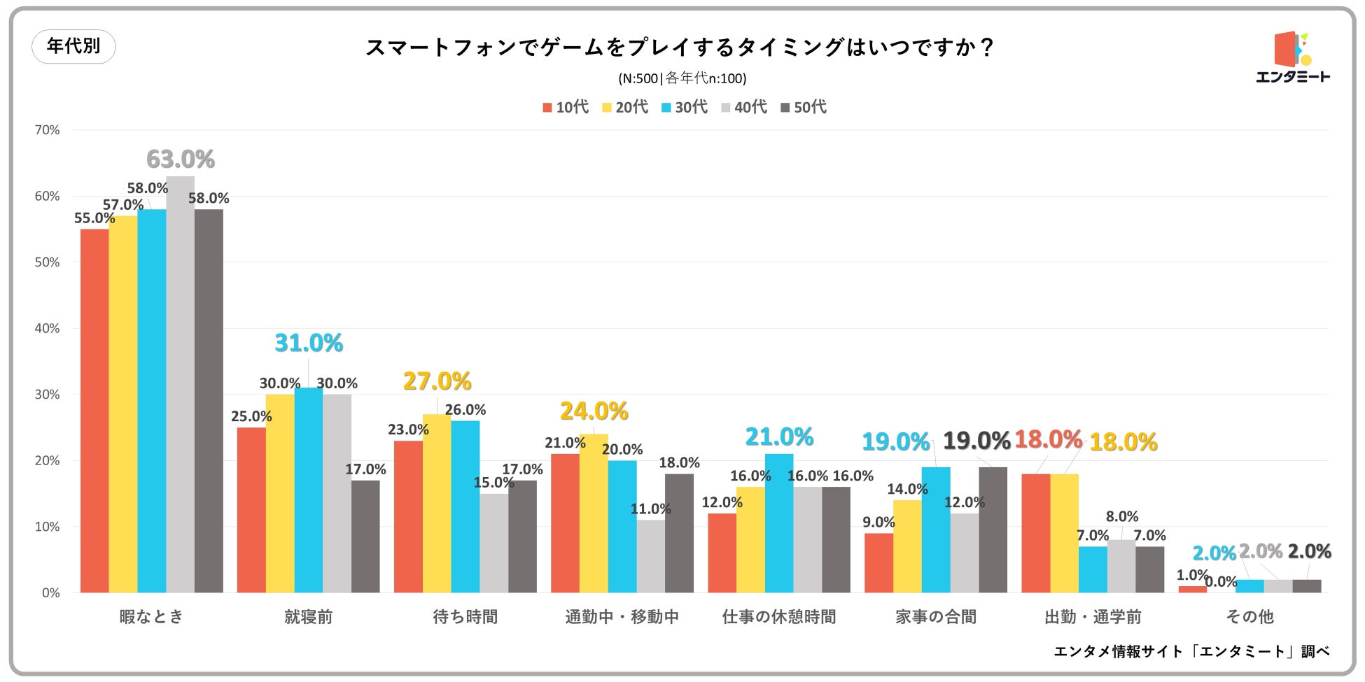 年代別で見ると、「暇なとき」と回答した人は全ての年代で50%を超えており、特に40代では63.0%と多くの人が暇つぶしとしてスマートフォンゲームをプレイしていることが分かります。また、「出勤・通学前」と回答した人は、10代・20代で18.0%と他の年代に比べて10%ほど高くなりました。タイムパフォーマンス(タイパ)を意識する傾向が強いと言われているZ世代では、出勤や通学前の短い時間でも手軽にプレイできるスマートフォンゲームで少しでも満足感を得ようとしているのかもしれません。