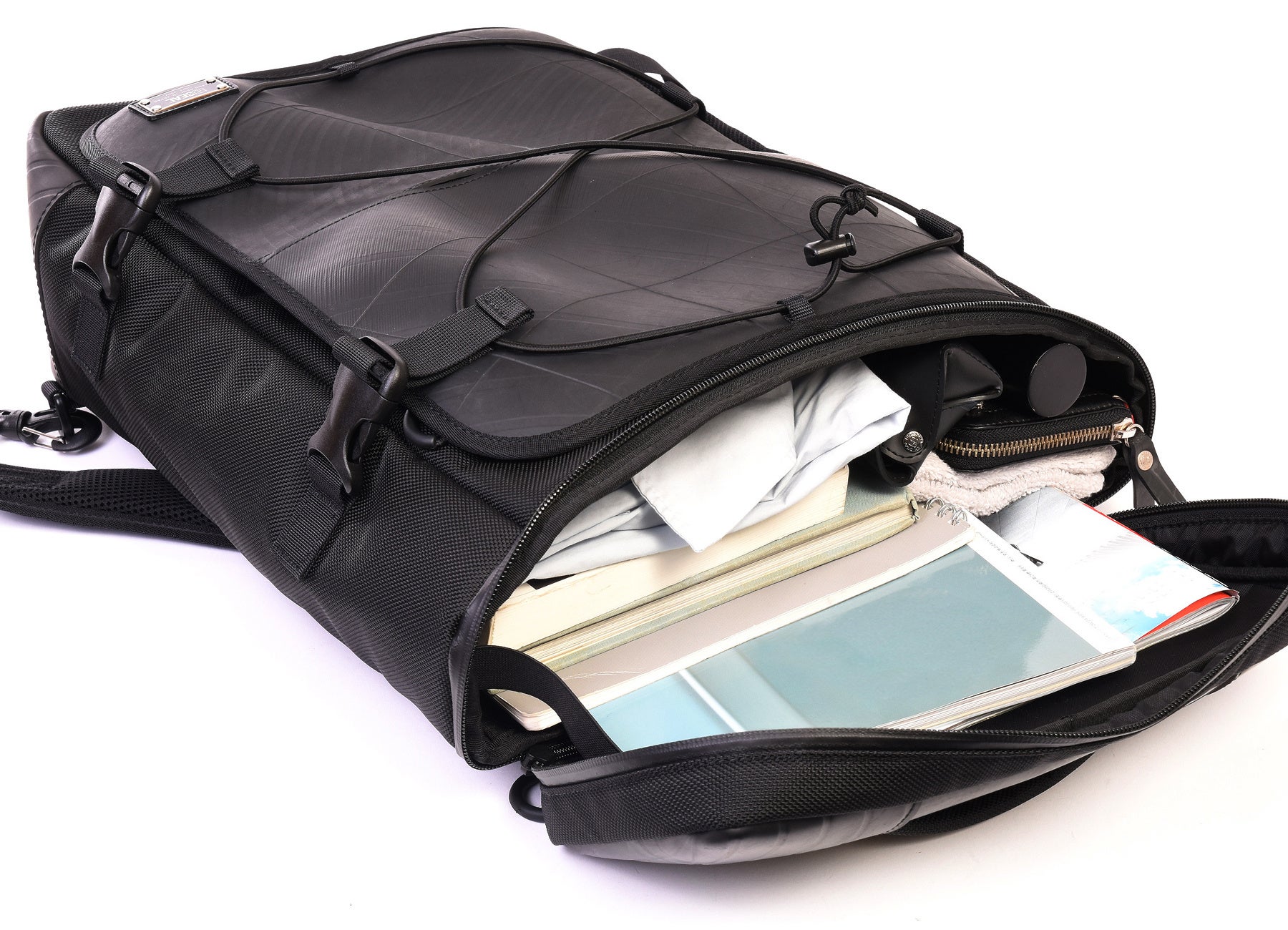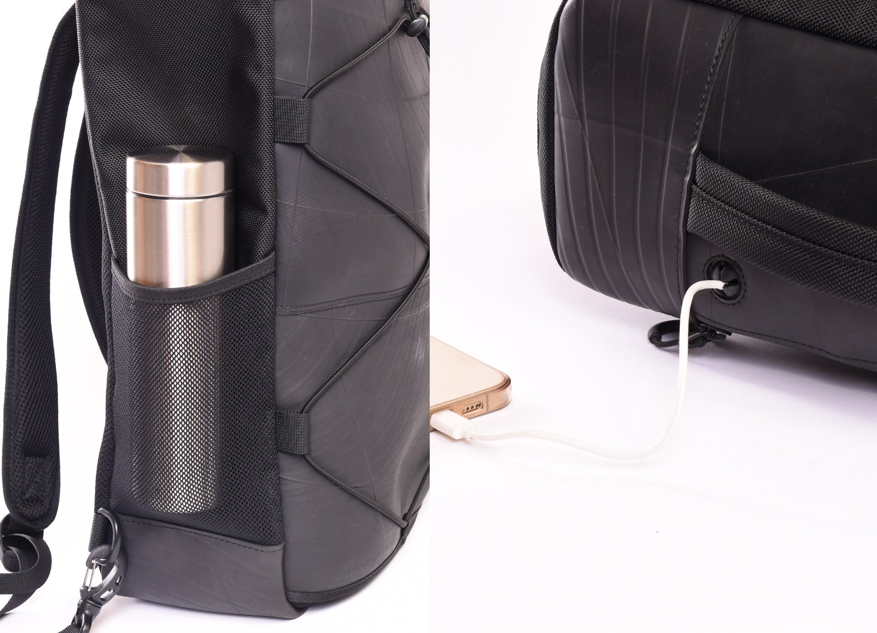 ベーシックなブラックカラーでまとめ、素材には廃タイヤと1680dナイロン、止水ファスナーを使用しています。防水性と耐久性に優れているので旅行用のトラベルバッグとして、また手荷物が多い外出時にも場所や環境を問わず様々なシーンでご使用いただけます。