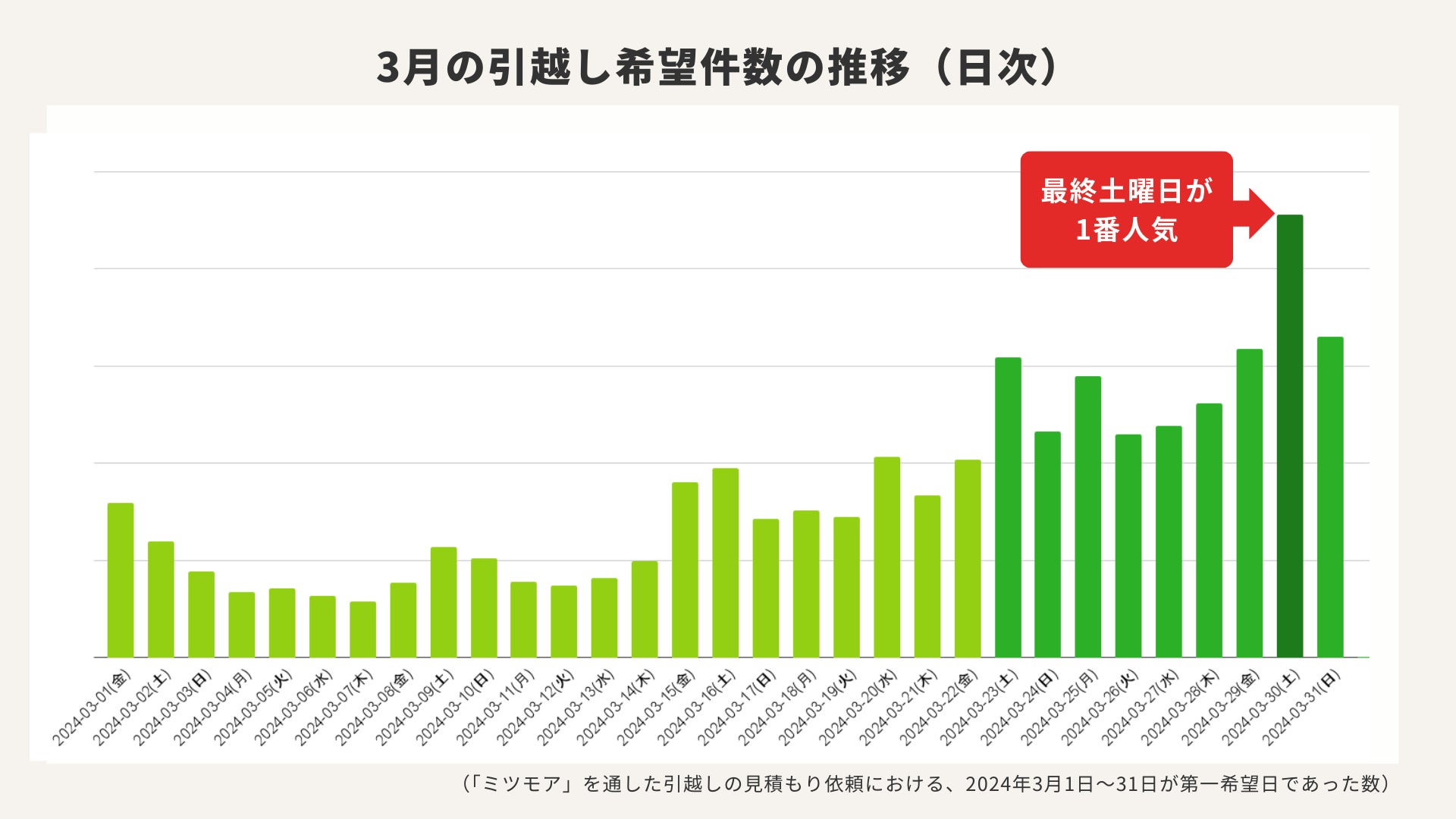 土曜日は翌日に荷解きがしやすいため、引越し日として人気があります。また、入退去のタイミングに合わせて多くの人が3月末に移動します。2024年も、3月30日(土)が最も需要が高い日でした。