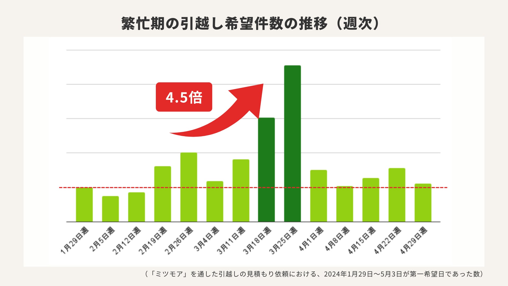上のグラフは、ミツモアを通じた2024年2月初週から4月最終週(1月最終週・5月初週を含む)の引越し希望件数の推移を示しています。