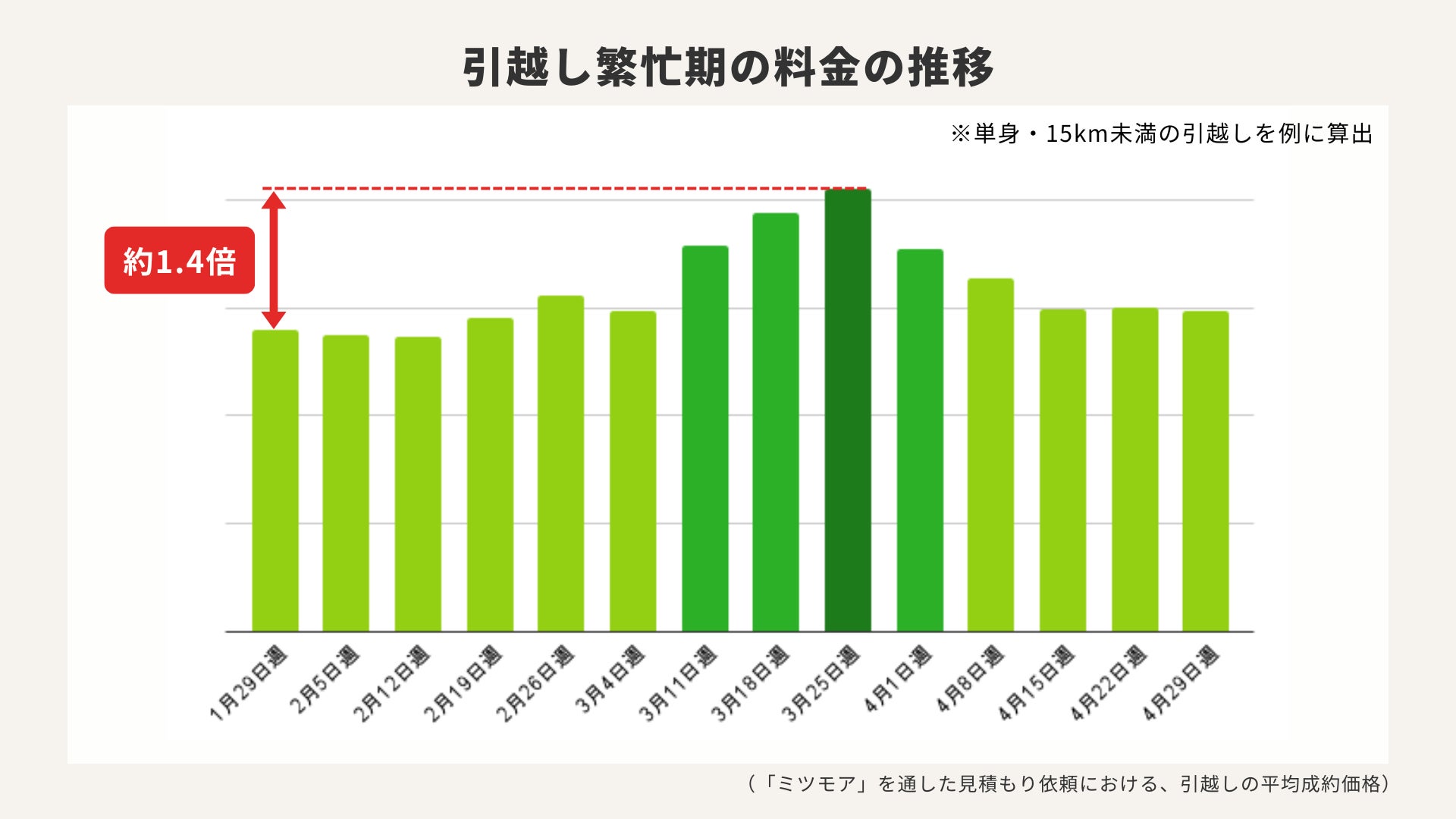 3月最終週の料金も、繁忙期前と比較して上昇します。たとえば15km未満の単身引越しでは、3月最終土曜の費用は1月末~2月頭の週と比べて約1.4倍でした。業者によっては、通常の2倍以上の価格に設定しているケースもあります。