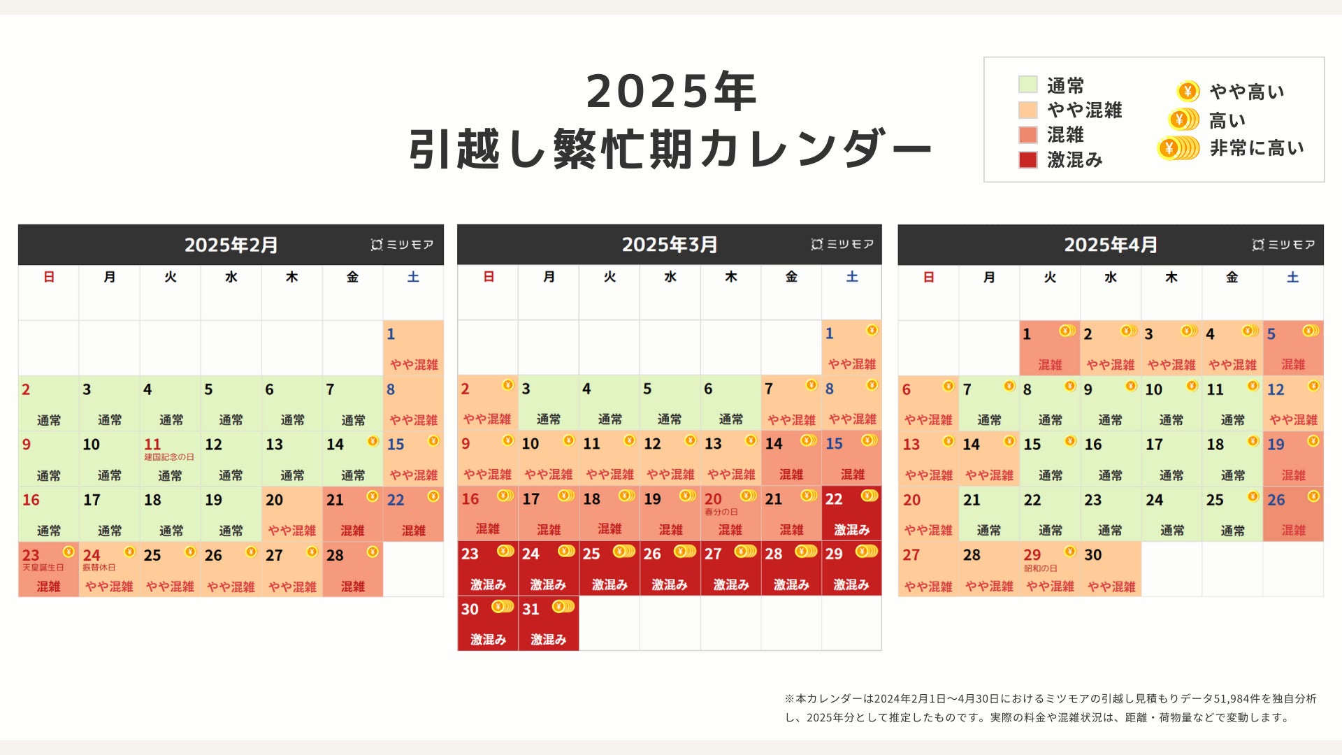 オンラインでの見積もり比較・受発注サービス「ミツモア」を運営する株式会社ミツモア(本社:東京都中央区、代表取締役:石川彩子)は、昨年の引越し見積もりデータをもとに、2025年2月~4月の引越し混雑度や料金予測を反映した「2025年引越し繁忙期カレンダー」を作成しました。