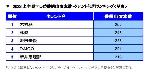 ▼2023上半期テレビ番組出演本数・タレント部門ランキング<関東>