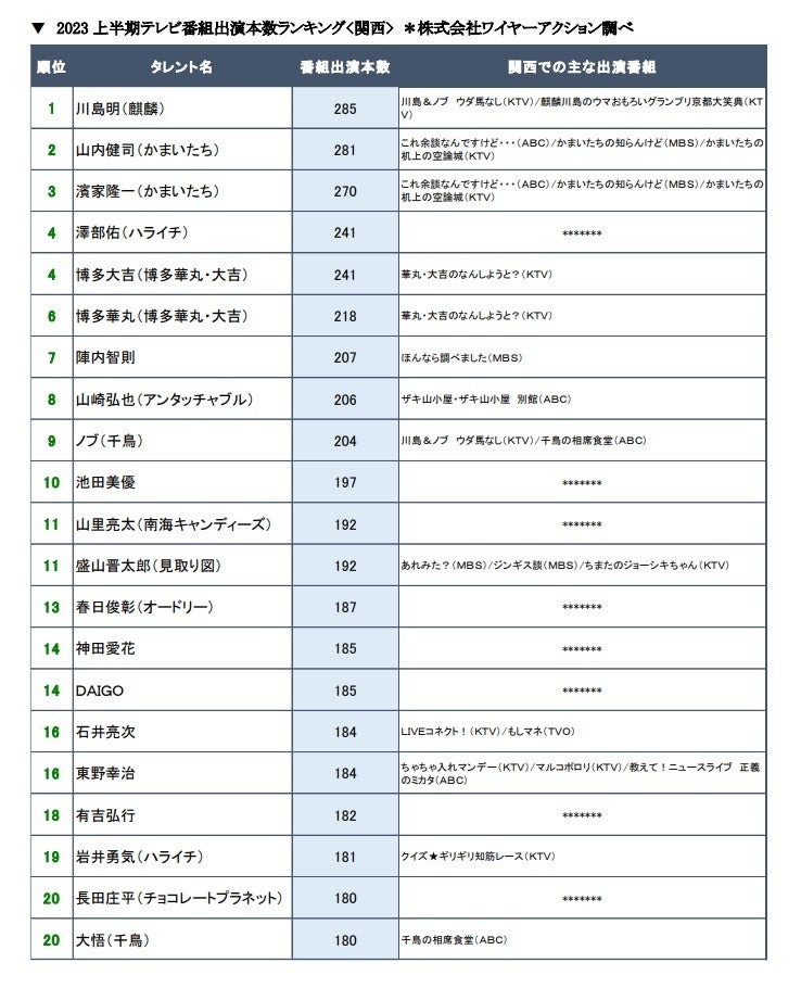 ▼2023上半期テレビ番組出演本数ランキング<関西> *株式会社ワイヤーアクション調べ
