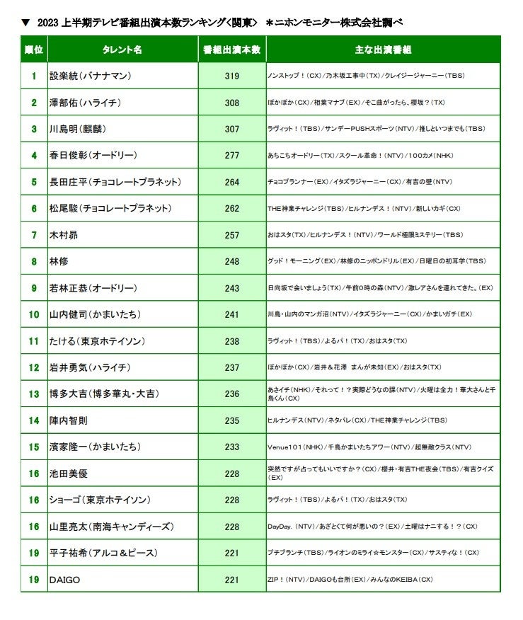 ▼2023上半期テレビ番組出演本数ランキング<関東> *ニホンモニター株式会社調べ