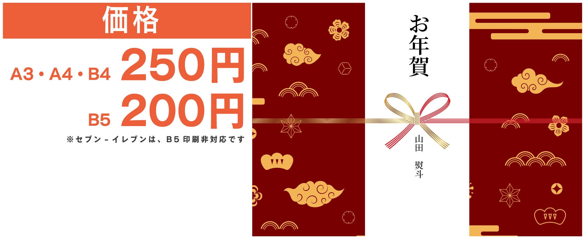 料金は、A3、A4、B4サイズが250円、B5サイズは200円でご利用いただけます。※セブンイレブンではB5はご利用いただけません。※印刷用紙はコピー用紙です。