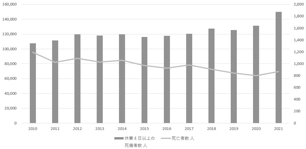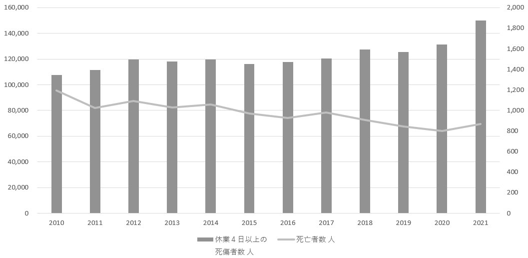 [労働災害による死傷者数、死亡者数]*資料出所 厚生労働省「労働災害発生状況」