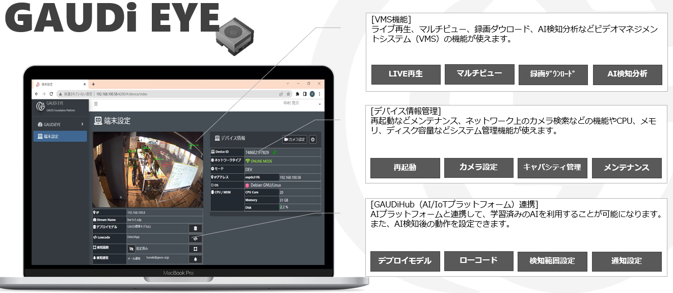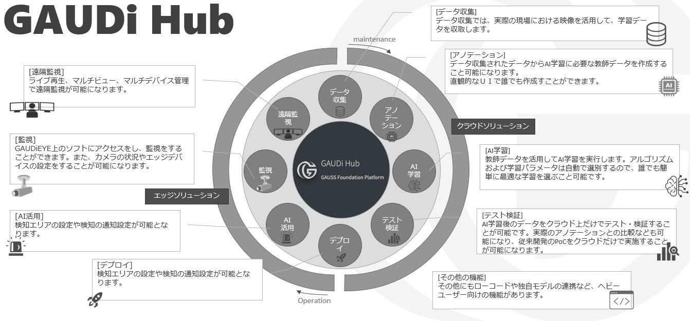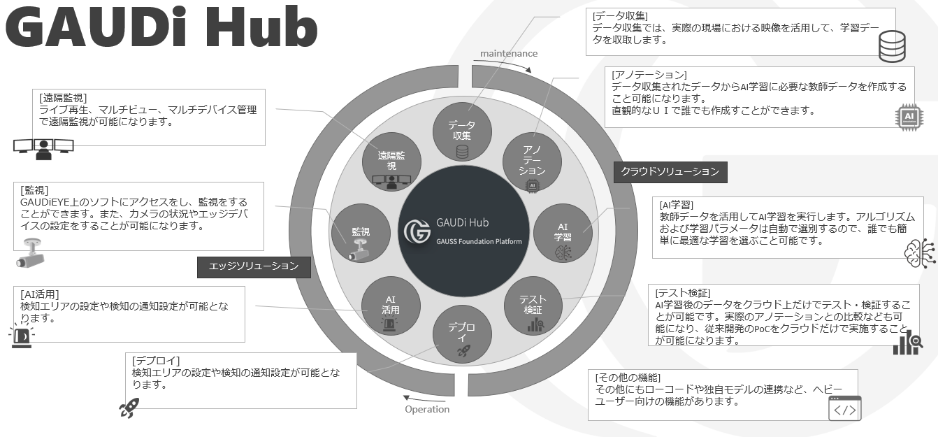 GAUDiHub(ガウディハブ)は、GAUDiEYE(エッジ端末やIoT端末を含む)とAIをクラウドで管理するAI×IoTプラットフォームになります。GAUDiEYEで取得した画像データを活用し、現場担当者の方がマウス操作だけで現場専用のAIを作成することが可能になります。AIの検証メニューも充実しており、従来の実証検証(PoC)をGAUDiHub上だけで行うことが可能になりました。作成したAIは、GAUDiEYEに設定し、すぐ現場で活用することが可能となっております。
