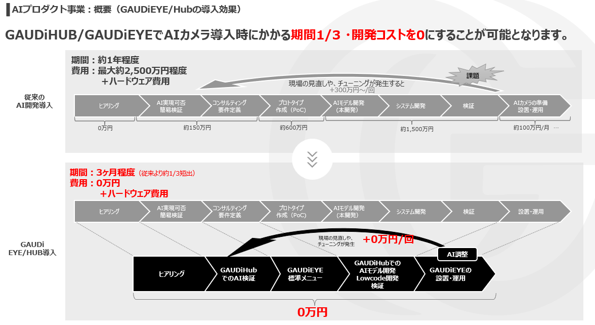 GAUDiEYE/HubでAIカメラ導入時にかかる期間を1/3 ・開発コストを0にすることを実現しました。