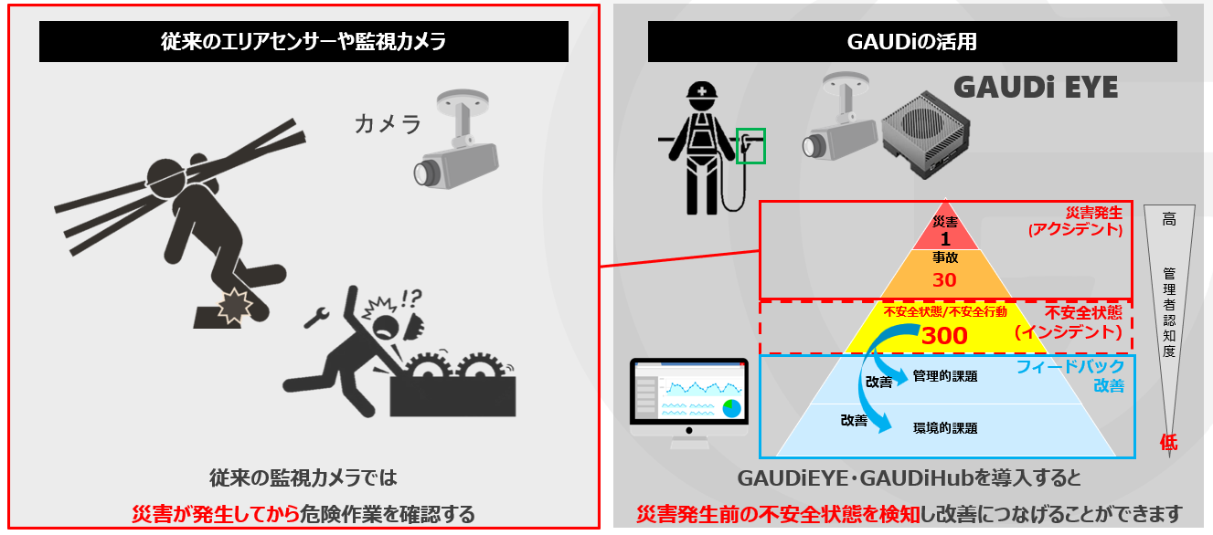 GAUSSは、上記課題を解決する「エッジAIカメラGAUDiEYE(ガウディアイ)」「AI×IoTプラットフォームGAUDiHub(ガウディハブ)」を提供しています。GAUDiの活用で、事故や災害発生につながる、不安全状態を検知することが可能となり、現場環境および作業改善を通して、労働災害を未然に防ぐことに寄与いたします。