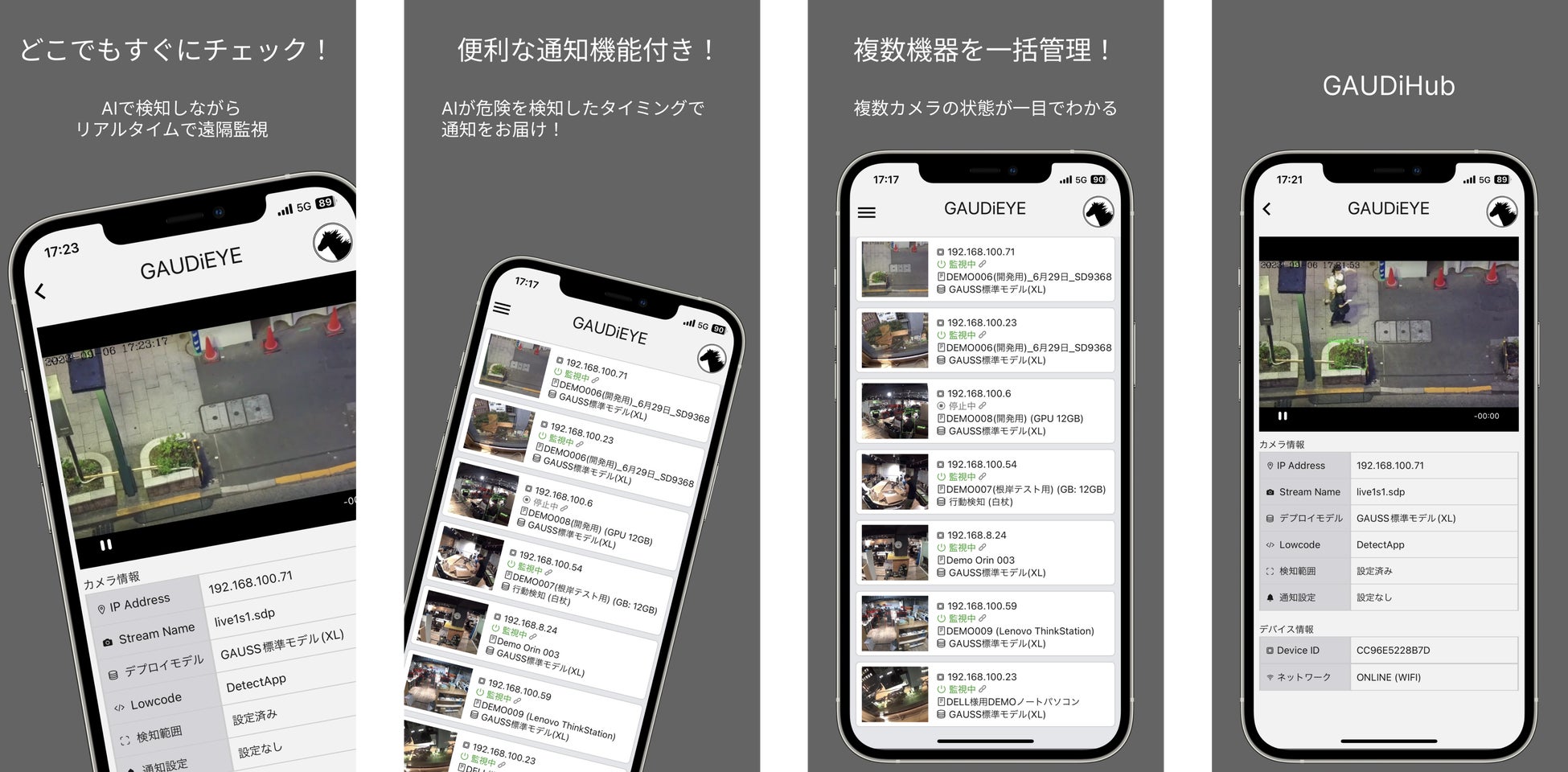 GAUDiHubのiPhone/Androidアプリを直近リリース予定となります。アプリケーションを活用することで、どこにいてもリアルタイムに現場を確認する事ができます。AIの検出結果は、スマートフォンの通知で受け取る事ができます。