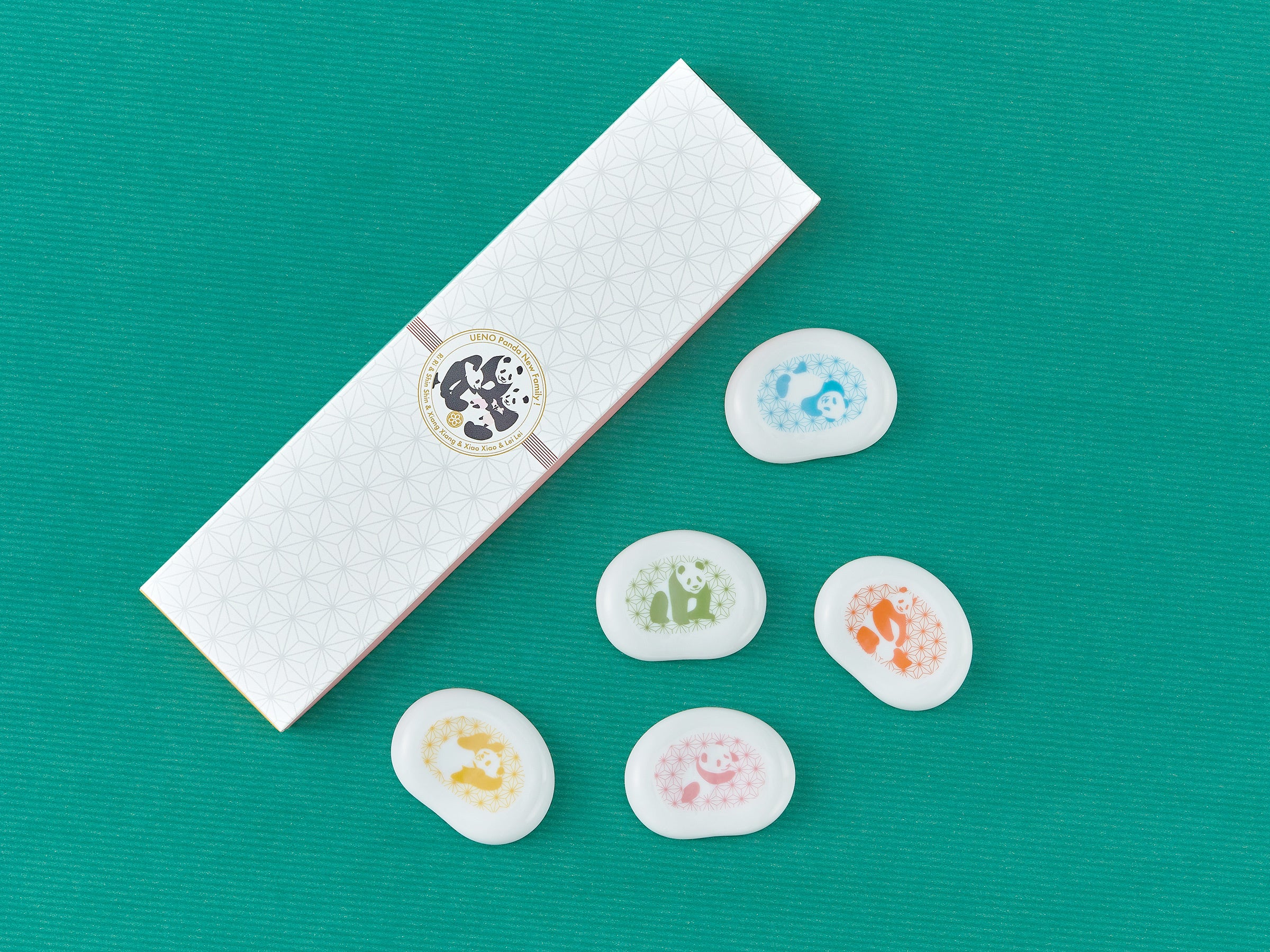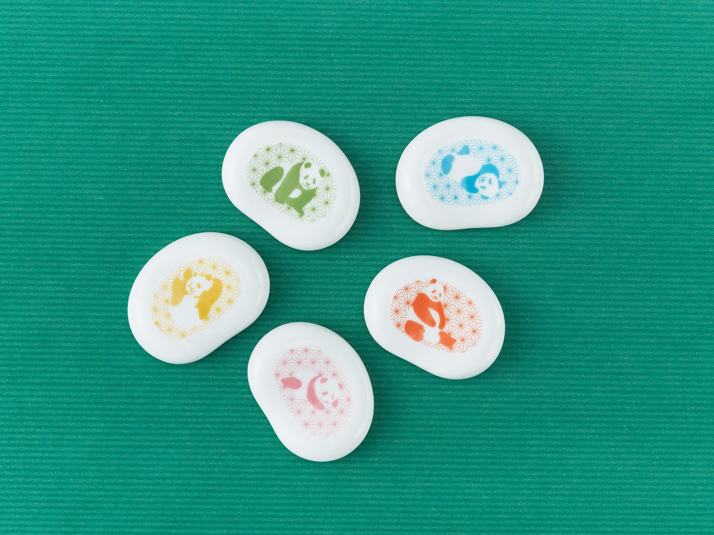 恩賜上野動物園のパンダファミリー(リーリー、シンシン、シャンシャン、シャオシャオ、レイレイ)をモチーフにしたデザインを、シンプルでおしゃれなそら豆型の箸置きに、あしらいました。