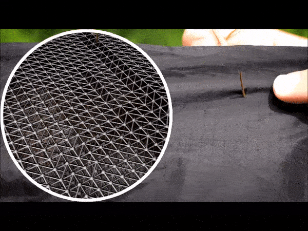 繊維が非常に細かい為、繊維は針や棘が刺去っても破壊されることなく、針を避けていきます。一時的に穴は空きますが、繊維は破壊されておらず、ただ針を避けただけなので、針を抜けば元通りに戻り自己修復していきます。