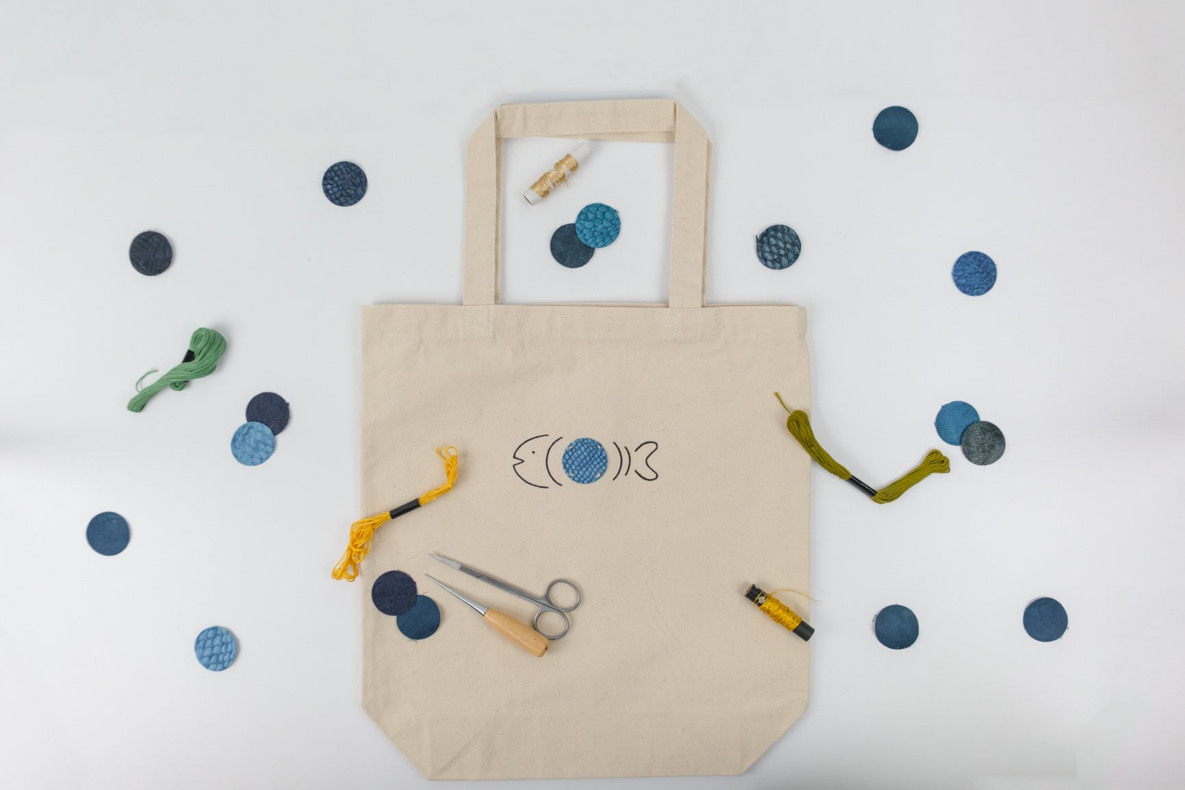 魚の皮を革にするフィッシュレザーブランド。敢えて機械化せず、人が介在するからこそ生み出せる「余白」のあるフィッシュレザーを提供。模様や色など個性豊かなフィッシュレザーの中から自分のお気に入りを選び、生地に縫うことで世界に1つのオリジナルトートバッグのワークショップを実施。