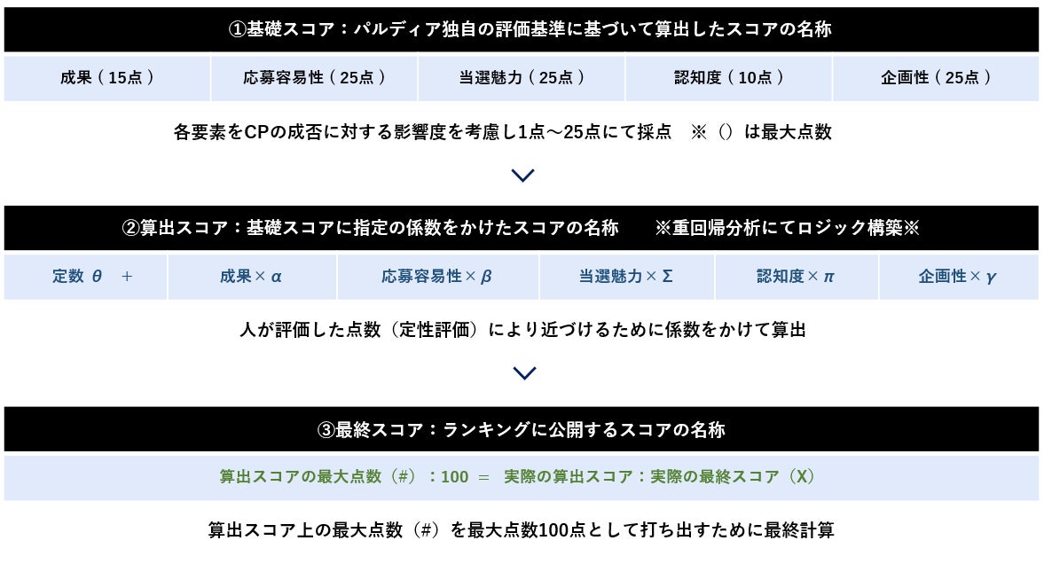 「基礎スコア」「算出スコア」「最終スコア」の三段階の評価プロセスを経て、キャンペーンの総合評価を行い、最終的にランキングを決定しております。